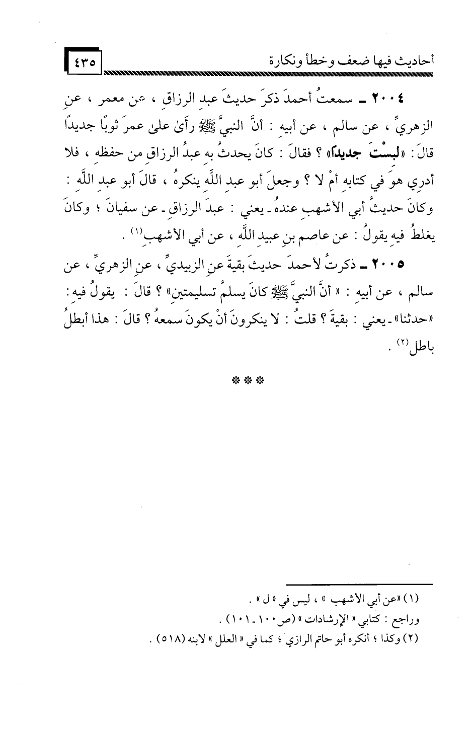 2004 - سَمِعْتُ أَحْمَدَ، ذَكَرَ حَدِيثَ عَبْدِ الرَّزَّاقِ، عَنْ مَعْمَرٍ، عَنِ الزُّهْرِيِّ، عَنْ سَالِمٍ، عَنْ أَبِيهِ " أَنَّ النَّبِيَّ صَلَّى اللَّهُ عَلَيْهِ وَسَلَّمَ رَأَى عَلَى عُمَرَ ثَوْبًا جَدِيدًا قَالَ: لَبِسْتَ جَدِيدًا " , فَقَالَ: كَانَ يُحَدِّثُ بِهِ عَبْدُ الرَّزَّاقِ مِنْ حِفْظِهِ، فَلَا أَدْرِي هُوَ فِي كِتَابِهِ أَمْ لَا؟ وَجَعَلَ أَبُو عَبْدِ اللَّهِ يُنْكِرُهُ، قَالَ أَبُو عَبْدِ اللَّهِ: وَكَانَ حَدِيثُ أَبِي الْأَشْهَبِ عِنْدَهُ، يَعْنِي: عَبْدَ الرَّزَّاقِ، عَنْ سُفْيَانَ، وَكَانَ يَغْلَطُ فِيهِ، يَقُولُ: عَنْ عَاصِمِ بْنِ عُبَيْدِ اللَّهِ، عَنْ أَبِي الْأَشْهَبِ
