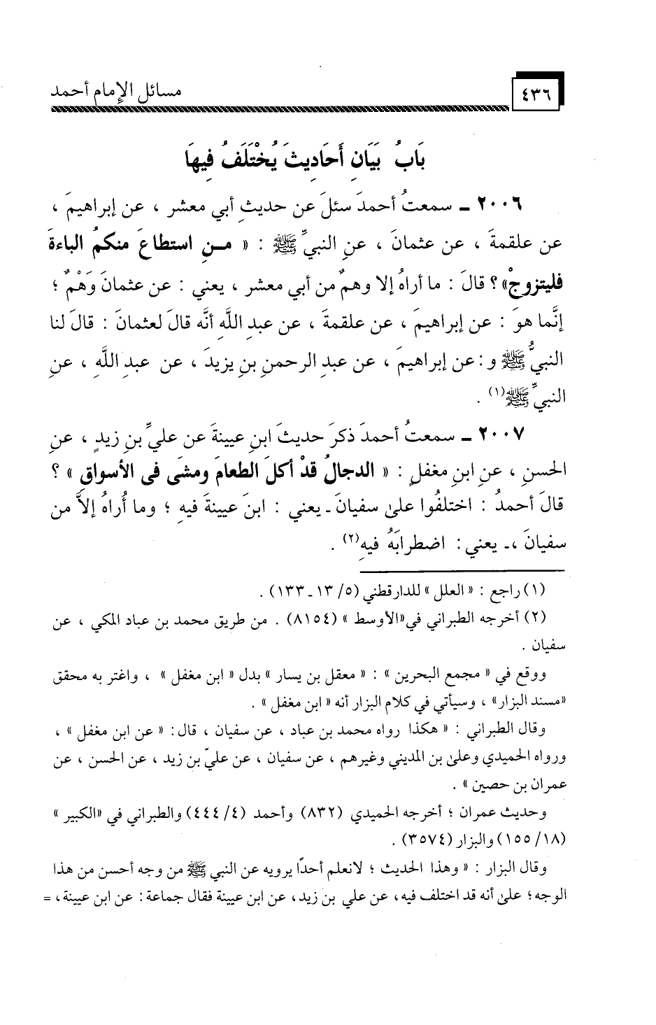 2006 - سَمِعْتُ أَحْمَدَ، سُئِلَ عَنْ حَدِيثِ أَبِي مَعْشَرٍ، عَنْ إِبْرَاهِيمَ، عَنْ عَلْقَمَةَ، عَنْ عُثْمَانَ، عَنِ النَّبِيِّ صَلَّى اللَّهُ عَلَيْهِ وَسَلَّمَ: «مَنِ اسْتَطَاعَ مِنْكُمُ الْبَاءَةَ، فَلْيَتَزَوَّجْ» , قَالَ: مَا أَرَاهُ إِلَّا وَهْمٌ مِنْ أَبِي مَعْشَرٍ، يَعْنِي: عَنْ عُثْمَانَ وَهْمٌ، إِنَّمَا هُوَ: عَنْ إِبْرَاهِيمَ، عَنْ عَلْقَمَةَ، عَنْ عَبْدِ اللَّهِ، أَنَّهُ قَالَ لِعُثْمَانَ: قَالَ لَنَا النَّبِيُّ صَلَّى اللَّهُ عَلَيْهِ وَسَلَّمَ، عَنْ إِبْرَاهِيمَ، عَنْ عَبْدِ الرَّحْمَنِ بْنِ يَزِيدَ، عَنْ عَبْدِ اللَّهِ، عَنِ النَّبِيِّ صَلَّى اللَّهُ عَلَيْهِ وَسَلَّمَ