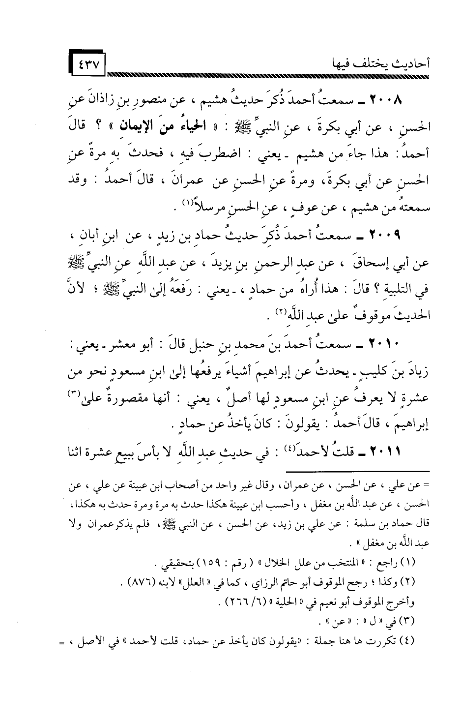 2008 - سَمِعْتُ أَحْمَدَ، ذَكِرَ حَدِيثَ هُشَيْمٍ، عَنْ مَنْصُورِ بْنِ زَاذَانَ، عَنِ الْحَسَنِ، عَنْ أَبِي بَكْرَةَ، عَنِ النَّبِيِّ صَلَّى اللَّهُ عَلَيْهِ وَسَلَّمَ: «الْحَيَاءُ مِنَ الْإِيمَانِ» , قَالَ أَحْمَدُ: هَذَا جَاءَ مِنْ هُشَيْمٍ، يَعْنِي: اضْطَرَبَ فِيهِ، فَحَدَّثَ بِهِ مَرَّةً عَنِ الْحَسَنِ عَنْ أَبِي بَكْرَةَ، وَمَرَّةً عَنِ الْحَسَنِ عَنْ عِمْرَانَ، قَالَ أَحْمَدُ: وَقَدْ سَمِعْتُهُ مِنْ هُشَيْمٍ، عَنْ عَوْفٍ، عَنِ الْحَسَنِ مُرْسَلًا