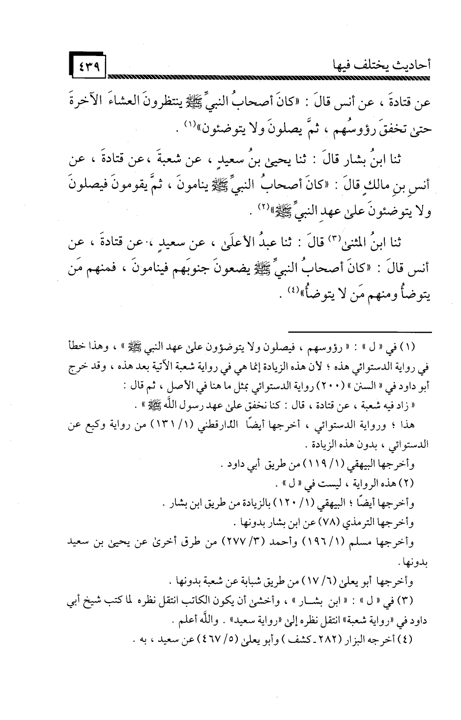 ثنا ابْنُ الْمُثَنَّى، قَالَ: ثَنَا عَبْدُ الْأَعْلَى، عَنْ سَعِيدٍ، عَنْ قَتَادَةَ، عَنْ أَنَسٍ، قَالَ: «كَانَ أَصْحَابُ النَّبِيِّ صَلَّى اللَّهُ عَلَيْهِ وَسَلَّمَ يَضَعُونَ جُنُوبَهُمْ فَيَنَامُونَ، فَمِنْهُمْ مَنْ يَتَوَضَّأُ، وَمِنْهُمْ مَنْ لَا يَتَوَضَّأُ»