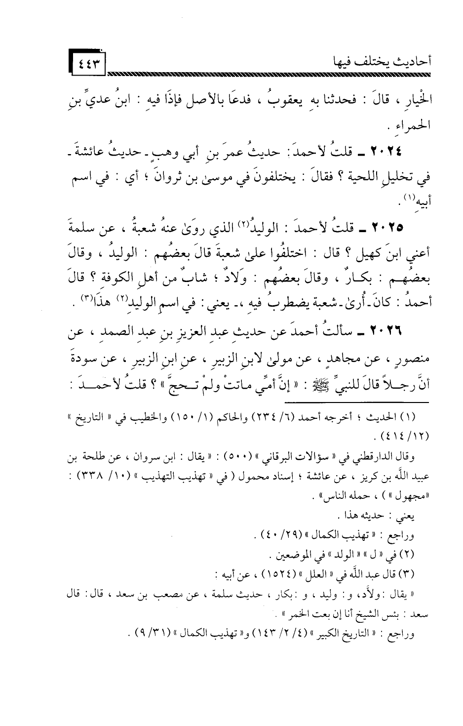 2025 - قُلْتُ لِأَحْمَدَ: الْوَلِيدُ الَّذِي رَوَى عَنْهُ شُعْبَةُ، عَنْ سَلَمَةَ أَعْنِي: ابْنَ كُهَيْلٍ؟ قَالَ: اخْتَلَفُوا عَلَى شُعْبَةَ، قَالَ بَعْضُهُمْ: الْوَلِيدُ، وَقَالَ بَعْضُهُمْ: بَكَّارٌ، وَقَالَ بَعْضُهُمْ وَلَّادٌ، شَابٌّ مِنْ أَهْلِ الْكُوفَةِ، قَالَ أَحْمَدُ: كَانَ أُرَى شُعْبَةَ يَضْطَرِبُ فِيهِ، يَعْنِي: فِي اسْمِ الْوَلِيدِ هَذَا.