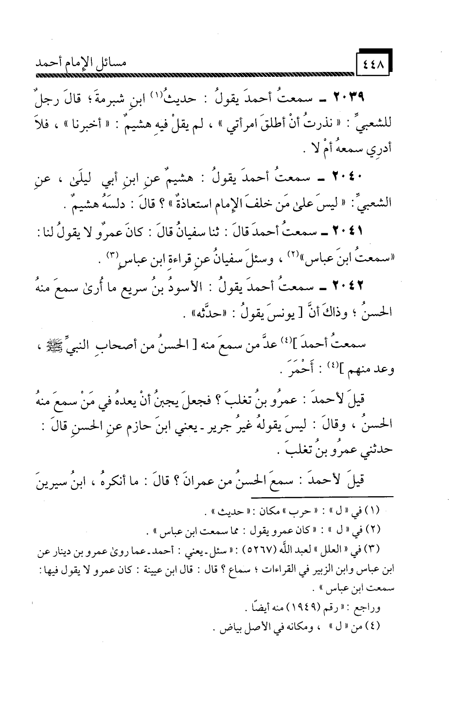 2039 - سَمِعْتُ أَحْمَدَ، يَقُولُ: حَدِيثُ ابْنِ شُبْرُمَةَ، قَالَ رَجُلٌ لِلشَّعْبِيِّ: «نَذَرْتُ أَنْ أُطَلِّقَ امْرَأَتِي» ، لَمْ يَقُلْ فِيهِ هُشَيْمٌ: أَخْبَرَنَا، فَلَا أَدْرِي سَمِعَهُ أَمْ لَا.
