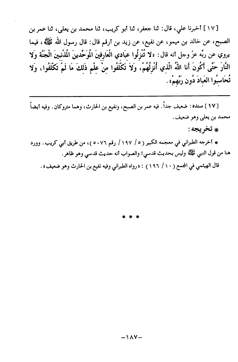 17 - أَخْبَرَنَا عَلِيٌّ قَالَ: ثنا جَعْفَرٌ, ثنا أَبُو كُرَيْبٍ, ثنا مُحَمَّدُ بْنُ يَعْلَى, ثنا عُمَرُ بْنُ الصُّبْحِ, عَنْ خَالِدِ بْنِ مَيْمُونٍ, عَنْ نُفَيْعٍ, عَنْ زَيْدِ بْنِ أَرْقَمَ, قَالَ: قَالَ رَسُولُ اللَّهِ صَلَّى اللهُ عَلَيْهِ وَسَلَّمَ, فِيمَا يَرْوِي عَنْ رَبِّهِ عَزَّ وَجَلَّ أَنَّهُ قَالَ: §" لَا تُنْزِلُوا عِبَادِي الْعَارِفِينَ الْمُوَحِّدِينَ الْمُذْنِبِينَ الْجَنَّةَ وَلَا النَّارَ حَتَّى أَكُونَ أَنَا اللَّهُ الَّذِي أُنْزِلُهُمْ, وَلَا تَكْلَفُوا مِنْ عِلْمِ ذَلِكَ مَا لَمْ تَكْلَفُوا, وَلَا تُحَاسِبُوا الْعِبَادَ دُونَ رَبِّهِمْ "