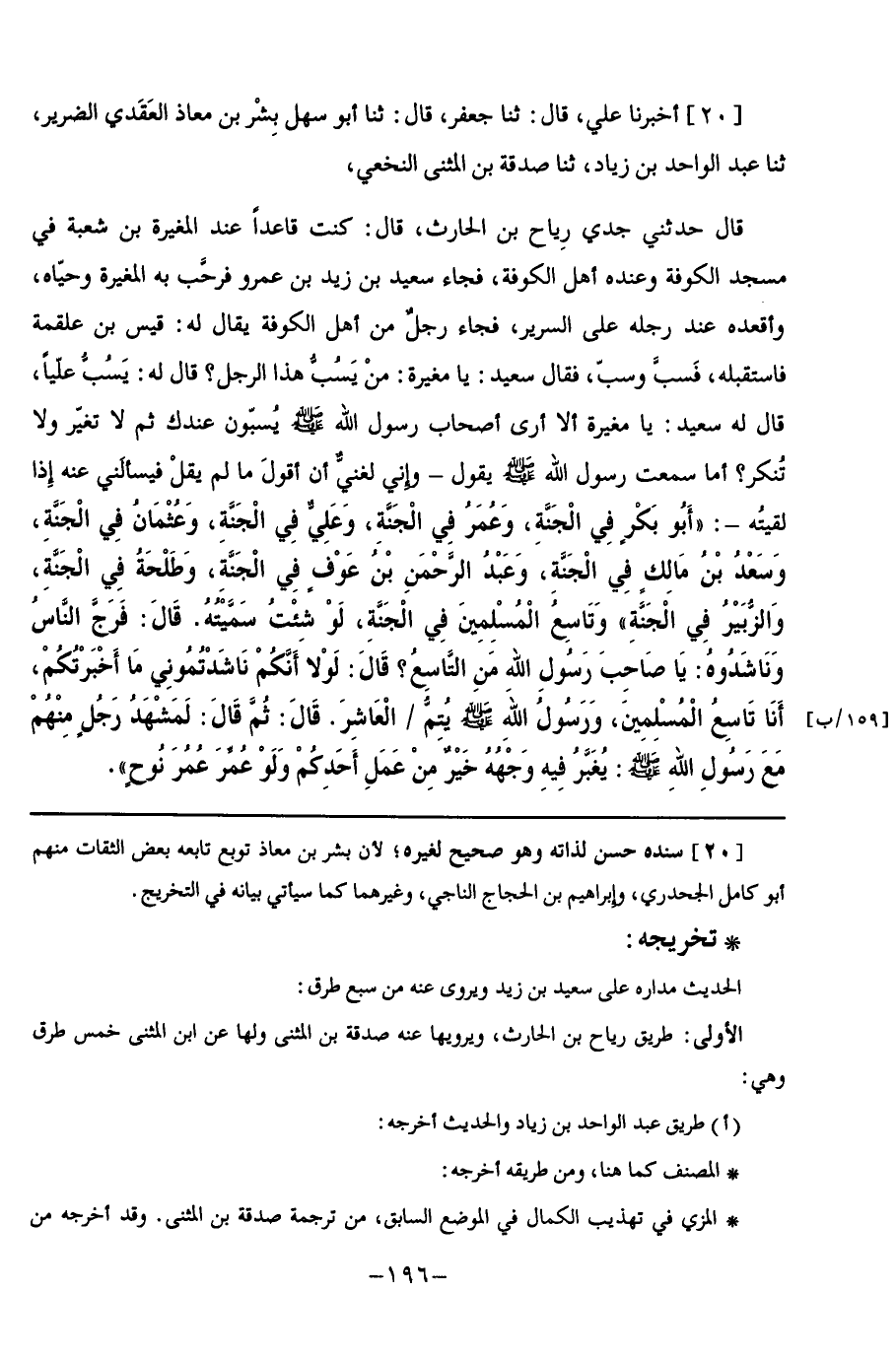 20 - أَخْبَرَنَا عَلِيٌّ قَالَ: ثنا جَعْفَرٌ قَالَ: ثنا أَبُو سَهْلٍ بِشْرُ بْنُ مُعَاذٍ الْعَقَدِيُّ الضَّرِيرُ, ثنا عَبْدُ الْوَاحِدِ بْنُ زِيَادٍ, ثنا صَدَقَةُ بْنُ الْمُثَنَّى النَّخَعِيُّ, قَالَ: حَدَّثَنِي جَدِّي رِيَاحُ بْنُ الْحَارِثِ قَالَ: كُنْتُ قَاعِدًا عِنْدَ الْمُغِيرَةِ بْنِ شُعْبَةَ فِي مَسْجِدِ الْكُوفَةِ وَعِنْدَهُ أَهْلُ الْكُوفَةِ فَجَاءَ سَعِيدُ بْنُ زَيْدِ بْنِ عَمْرٍو فَرَحَّبَ بِهِ الْمُغِيرَةُ وَحَيَّاهُ وَأَقْعَدَهُ عِنْدَ رِجْلِهِ عَلَى السَّرِيرِ, فَجَاءَ رَجُلٌ مِنْ أَهْلِ الْكُوفَةِ يُقَالُ لَهُ: قَيْسُ بْنُ عَلْقَمَةَ فَاسْتَقْبَلَهُ, فَسَبَّ وَسَبَّ, فَقَالَ سَعِيدٌ: يَا مُغِيرَةُ مَنْ يَسُبُّ هَذَا الرَّجُلَ؟ قَالَ لَهُ: يَسُبُّ عَلِيًّا قَالَ لَهُ سَعِيدٌ: يَا مُغِيرَةُ أَلَا أَرَى أَصْحَابَ رَسُولِ اللَّهِ صَلَّى اللهُ عَلَيْهِ وَسَلَّمَ يُسَبُّونَ عِنْدَكَ ثُمَّ لَا تُغَيِّرُ وَلَا تُنْكِرُ؟ أَمَا سَمِعْتَ رَسُولَ اللَّهِ صَلَّى اللهُ عَلَيْهِ وَسَلَّمَ يَقُولُ وَإِنِّي لَغَنِيُّ أَنْ أَقُولَ مَا لَمْ يَقُلْ فَيَسْأَلَنِي عَنْهُ إِذَا لَقِيتُهُ: §" أَبُو بَكْرٍ فِي الْجَنَّةِ, وَعُمَرُ فِي الْجَنَّةِ, وَعَلِيٌّ فِي الْجَنَّةِ, وَعُثْمَانُ فِي الْجَنَّةِ, وَسَعْدُ بْنُ مَالِكٍ فِي الْجَنَّةِ, وَعَبْدُ الرَّحْمَنِ بْنُ عَوْفٍ فِي الْجَنَّةِ, وَطَلْحَةُ فِي الْجَنَّةِ, وَالزُّبَيْرُ فِي الْجَنَّةِ ". وَتَاسِعُ الْمُسْلِمِينَ فِي الْجَنَّةِ لَوْ شِئْتَ سَمَّيْتُهُ. قَالَ: فَرَجَّ النَّاسُ وَنَاشَدُوهُ: يَا صَاحِبَ رَسُولِ اللَّهِ مَنِ التَّاسِعُ؟ قَالَ: لَوْلَا أَنَّكُمْ نَاشَدْتُمُونِي مَا أَخْبَرْتُكُمْ, أَنَا تَاسِعُ الْمُسْلِمِينَ, وَرَسُولُ اللَّهِ صَلَّى اللهُ عَلَيْهِ وَسَلَّمَ يُتِمُّ الْعَاشِرَ. قَالَ: ثُمَّ قَالَ: لَمَشْهَدُ رَجُلٍ مِنْهُمْ مَعَ رَسُولِ اللَّهِ صَلَّى اللهُ عَلَيْهِ وَسَلَّمَ يُغَبَّرُ فِيهِ وَجْهُهُ خَيْرٌ مِنْ عَمَلِ أَحَدِكُمْ وَلَوْ عُمِّرَ عُمْرَ نُوحٍ