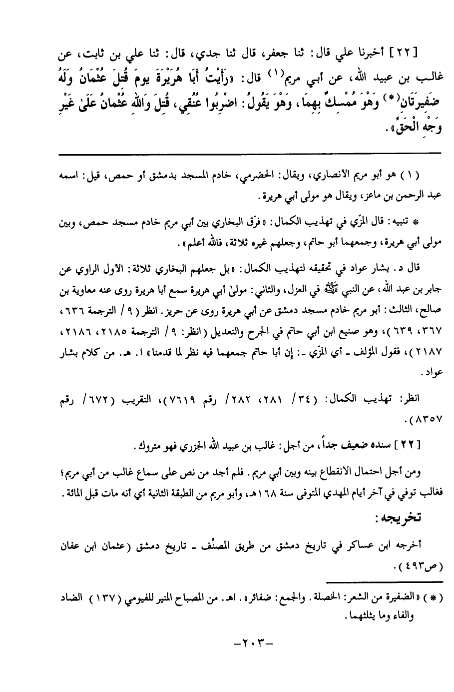 22 - أَخْبَرَنَا عَلِيٌّ قَالَ: ثنا جَعْفَرٌ ثنا جَدِّي, قَالَ: ثنا عَلِيُّ بْنُ ثَابِتٍ, عَنْ غَالِبِ بْنِ عُبَيْدِ اللَّهِ, عَنْ أَبِي مَرْيَمَ, قَالَ: رَأَيْتُ أَبَا هُرَيْرَةَ يَوْمَ قُتِلَ عُثْمَانُ وَلَهُ ضَفِيرَتَانِ وَهُوَ مُمْسِكٌ بِهِمَا وَهُوَ يَقُولُ: اضْرِبُوا عُنُقِي, §قُتِلَ وَاللَّهِ عُثْمَانُ عَلَى غَيْرِ وَجْهِ الْحَقِّ "