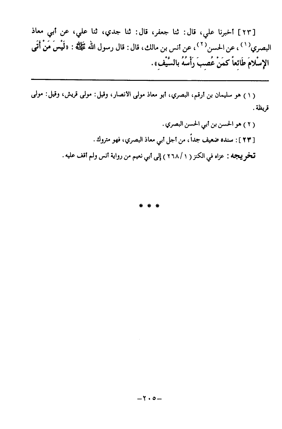23 - أَخْبَرَنَا عَلِيٌّ قَالَ: ثنا جَعْفَرٌ, قَالَ: ثنا جَدِّي, ثنا عَلِيٌّ, عَنْ أَبِي مُعَاذٍ الْبَصْرِيِّ, عَنِ الْحَسَنِ, عَنْ أَنَسِ بْنِ مَالِكٍ, قَالَ: قَالَ رَسُولُ اللَّهِ صَلَّى اللهُ عَلَيْهِ وَسَلَّمَ: §" لَيْسَ مَنْ أَتَى الْإِسْلَامَ طَائِعًا كَمَنْ عُصِبَ رَأْسُهُ بِالسَّيْفِ "