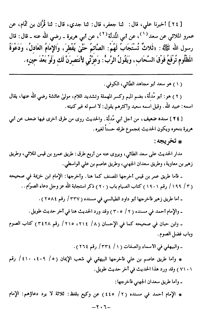 24 - أَخْبَرَنَا عَلِيٌّ قَالَ: ثنا جَعْفَرٌ, قَالَ: ثنا جَدِّي, قَالَ: ثنا قُرَّانُ بْنُ تَمَّامٍ, عَنْ عَمْرٍو الْمُلَائِيِّ, عَنْ سَعْدٍ, عَنْ أَبِي الْمُدِلَّةَ, عَنْ أَبِي هُرَيْرَةَ, رَضِيَ اللَّهُ عَنْهُ قَالَ: قَالَ رَسُولُ اللَّهِ صَلَّى اللهُ عَلَيْهِ وَسَلَّمَ: " §ثَلَاثٌ تُسْتَجَابُ لَهُمُ: الصَّائِمُ حَتَّى يُفْطِرَ, وَالْإِمَامُ الْعَادِلُ, وَدَعْوَةُ الْمَظْلُومِ تُرْفَعُ فَوْقَ السَّحَابِ, وَيَقُولُ الرَّبُّ: وَعِزَّتِي لَأَنْتَصِرَنَّ لَكِ وَلَوْ بَعْدَ حِينٍ "
