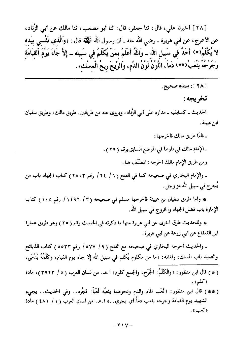 28 - أَخْبَرَنَا عَلِيٌّ قَالَ: ثنا جَعْفَرٌ, قَالَ: ثنا أَبُو مُصْعَبٍ, ثنا مَالِكٌ, عَنْ أَبِي الزِّنَادِ, عَنِ الْأَعْرَجِ, عَنْ أَبِي هُرَيْرَةَ, رَضِيَ اللَّهُ عَنْهُ أَنَّ رَسُولَ اللَّهِ صَلَّى اللهُ عَلَيْهِ وَسَلَّمَ قَالَ: " وَالَّذِي نَفْسِي بِيَدِهِ §لَا يُكْلَمُ أَحَدٌ فِي سَبِيلِ اللَّهِ - وَاللَّهُ أَعْلَمُ بِمَنْ يُكْلَمُ فِي سَبِيلِهِ - إِلَّا جَاءَ يَوْمَ الْقِيَامَةِ وَجُرْحُهُ يَثْعَبُ دَمًا, اللَّوْنُ لَوْنُ الدَّمِ, وَالرِّيحُ رِيحُ الْمِسْكِ "