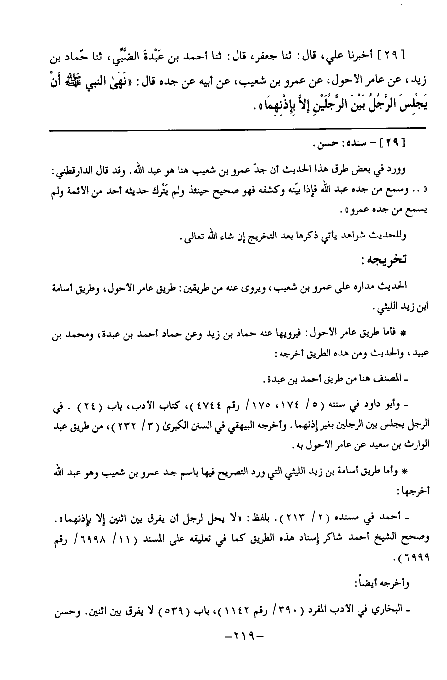29 - أَخْبَرَنَا عَلِيٌّ قَالَ: ثنا جَعْفَرٌ, قَالَ: ثنا أَحْمَدُ بْنُ عَبْدَةَ الضَّبِّيُّ, ثنا حَمَّادُ بْنُ زَيْدٍ, عَنْ عَامِرٍ الْأَحْوَلِ, عَنْ عَمْرِو بْنِ شُعَيْبٍ, عَنْ أَبِيهِ, عَنْ جَدِّهِ, قَالَ: §نَهَى النَّبِيُّ صَلَّى اللهُ عَلَيْهِ وَسَلَّمَ أَنْ يَجْلِسَ الرَّجُلُ بَيْنَ الرَّجُلَيْنِ إِلَّا بِإِذْنِهِمَا