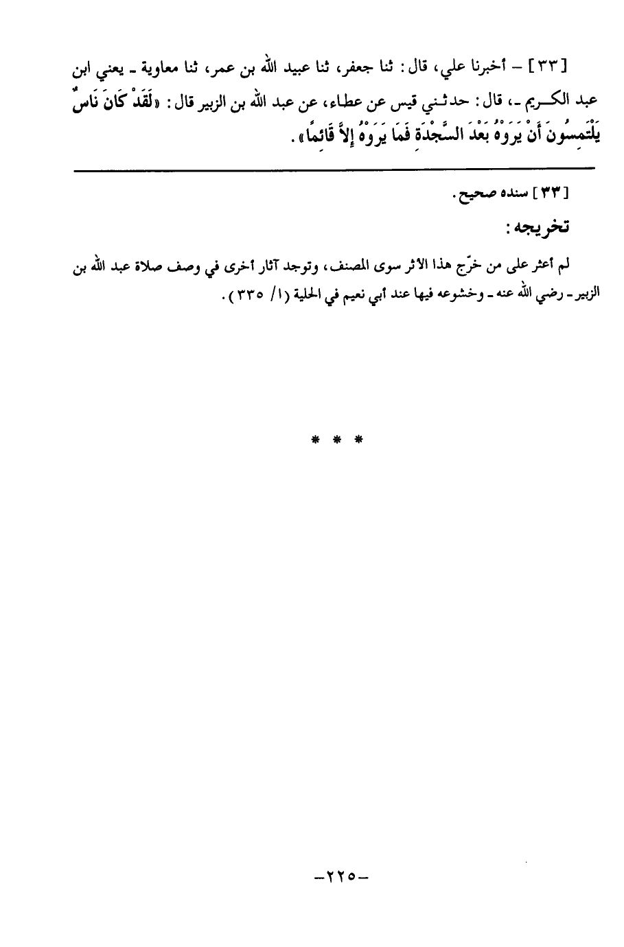 33 - أَخْبَرَنَا عَلِيٌّ قَالَ: ثنا جَعْفَرٌ، ثنا عُبَيْدُ اللَّهِ بْنُ عُمَرَ, ثنا مُعَاوِيَةُ يَعْنِي ابْنَ عَبْدَ الْكَرِيمِ قَالَ: حَدَّثَنِي قَيْسٌ عَنْ عَطَاءٍ, عَنْ عَبْدِ اللَّهِ بْنِ الزُّبَيْرِ, قَالَ: §" لَقَدْ كَانَ نَاسٌ يَلْتَمِسُونَ أَنْ يَرَوْهُ بَعْدَ السَّجْدَةِ فَمَا يَرَوْهُ إِلَّا قَائِمًا