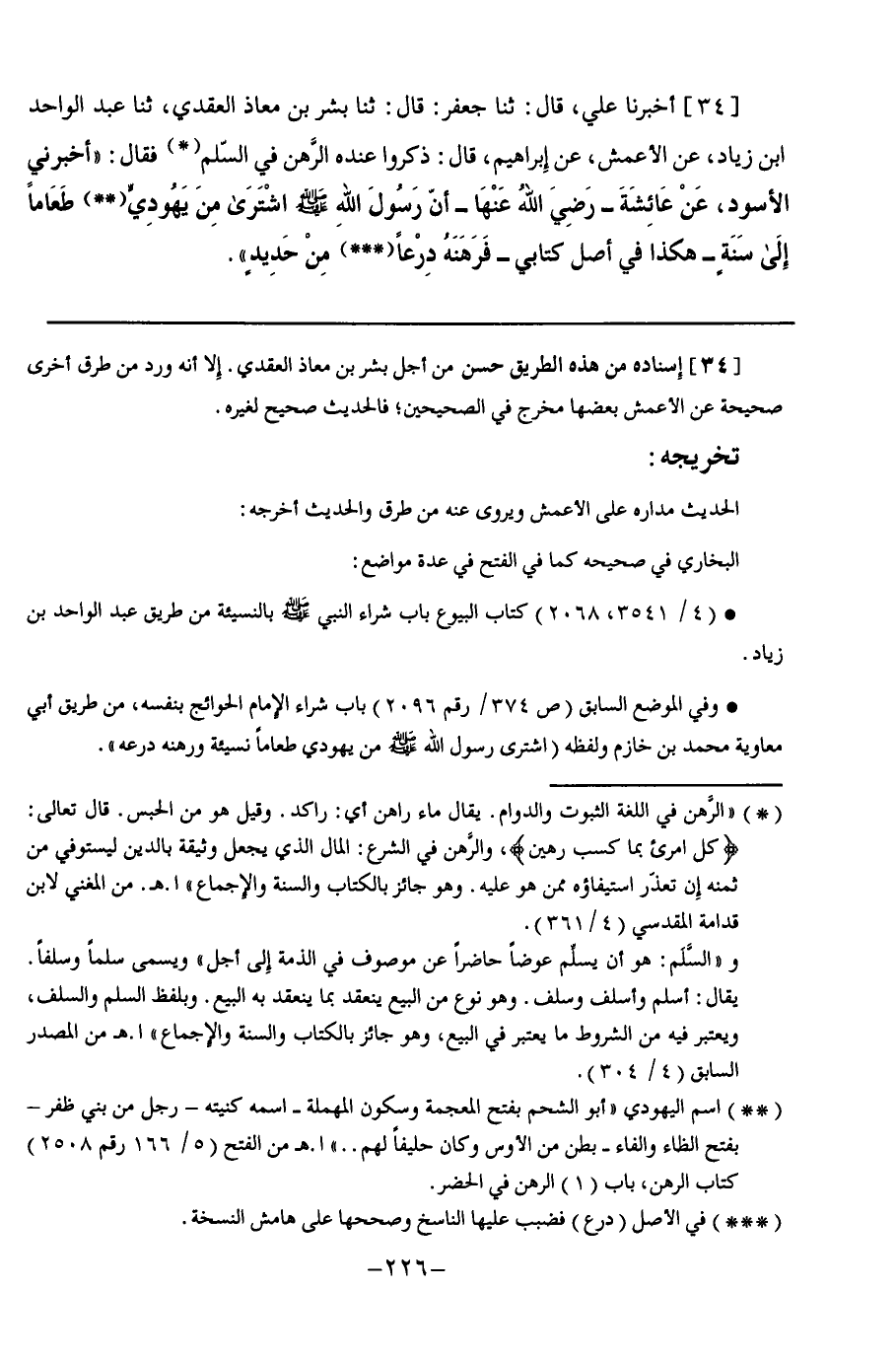 34 - أَخْبَرَنَا عَلِيٌّ قَالَ: ثنا جَعْفَرٌ، قَالَ: ثَنَا بِشْرُ بْنُ مُعَاذٍ الْعَقَدِيُّ, ثنا عَبْدُ الْوَاحِدِ بْنُ زِيَادٍ, عَنِ الْأَعْمَشِ, عَنْ إِبْرَاهِيمَ, قَالَ: ذَكَرُوا عِنْدَهُ الرَّهْنَ فِي السَّلَمِ فَقَالَ: أَخْبَرَنِي الْأَسْوَدُ, عَنْ عَائِشَةَ رَضِيَ اللَّهُ عَنْهَا أَنَّ رَسُولَ اللَّهِ صَلَّى اللهُ عَلَيْهِ وَسَلَّمَ §اشْتَرَى مِنْ يَهُودِيٍّ طَعَامًا إِلَى سَنَةٍ - هَكَذَا فِي أَصْلِ كِتَابِي - فَرَهَنَهُ دِرْعًا مِنْ حَدِيدٍ