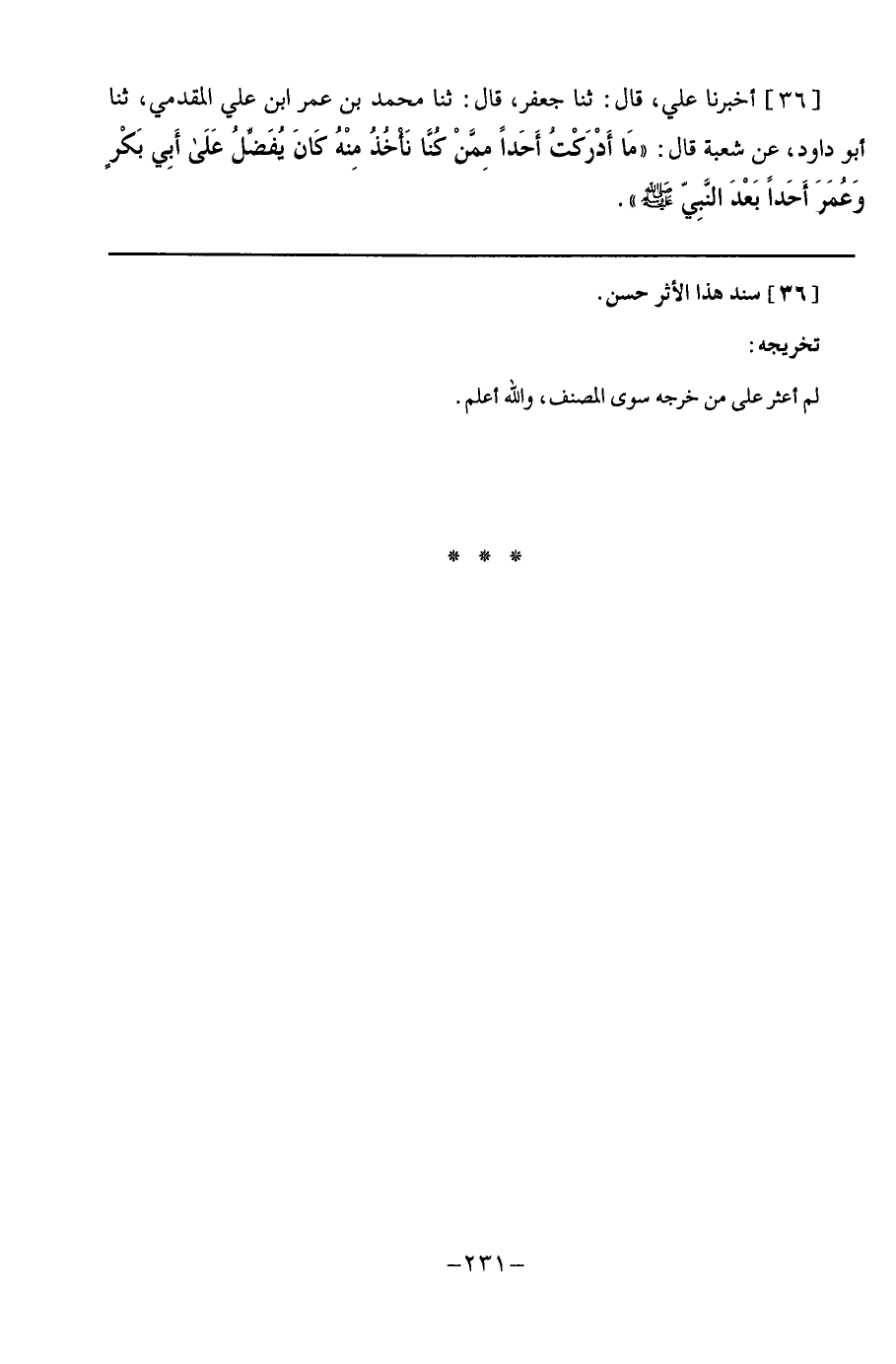 36 - أَخْبَرَنَا عَلِيٌّ قَالَ: ثنا جَعْفَرٌ, قَالَ: ثنا مُحَمَّدُ بْنُ عُمَرَ بْنُ عَلِيٍّ الْمُقَدَّمِيُّ, ثنا أَبُو دَاوُدَ, عَنْ شُعْبَةَ, قَالَ: §" مَا أَدْرَكْتُ أَحَدًا مِمَّنْ كُنَّا نَأْخُذُ مِنْهُ كَانَ يُفَضِّلُ عَلَى أَبِي بَكْرٍ وَعُمَرَ أَحَدًا بَعْدَ النَّبِيِّ صَلَّى اللهُ عَلَيْهِ وَسَلَّمَ