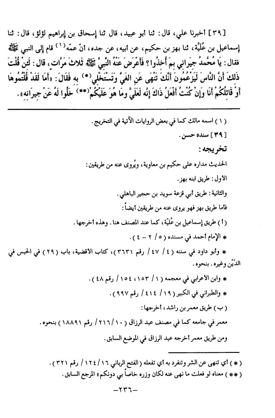 39 - أَخْبَرَنَا عَلِيٌّ قَالَ: ثنا أَبُو عُبَيْدٍ, قَالَ: ثنا إِسْحَاقُ بْنُ إِبْرَاهِيمَ لُؤْلُؤٌ قَالَ: ثنا إِسْمَاعِيلُ ابْنُ عُلَيَّةَ, ثنا بَهْزُ بْنُ حَكِيمٍ, عَنْ أَبِيهِ, عَنْ جَدِّهِ, أَنَّ عَمَّهَ, قَامَ إِلَى النَّبِيِّ صَلَّى اللهُ عَلَيْهِ وَسَلَّمَ فَقَالَ: يَا مُحَمَّدُ جِيرَانِي بِمَ أُخِذُوا؟ فَأَعْرَضَ عَنْهُ النَّبِيُّ صَلَّى اللهُ عَلَيْهِ وَسَلَّمَ ثَلَاثَ مَرَّاتٍ, قَالَ: لَئِنْ قُلْتَ ذَلِكَ أَنَّ النَّاسَ لَيَزْعُمُونَ أَنَّكَ تَنْهَى عَنِ الْغَيِّ وَتَسْتَخْلِي بِهِ فَقَالَ: " أَمَا لَقَدْ قُلْتُمُوهَا أَوْ قَائِلُكُمْ أَنَا وَإِنْ كُنْتُ أَفْعَلُ ذَاكَ إِنَّهُ لَعَلَيَّ وَمَا هُوَ عَلَيْكُمْ §خَلُّوا لَهُ عَنْ جِيرَانِهِ "