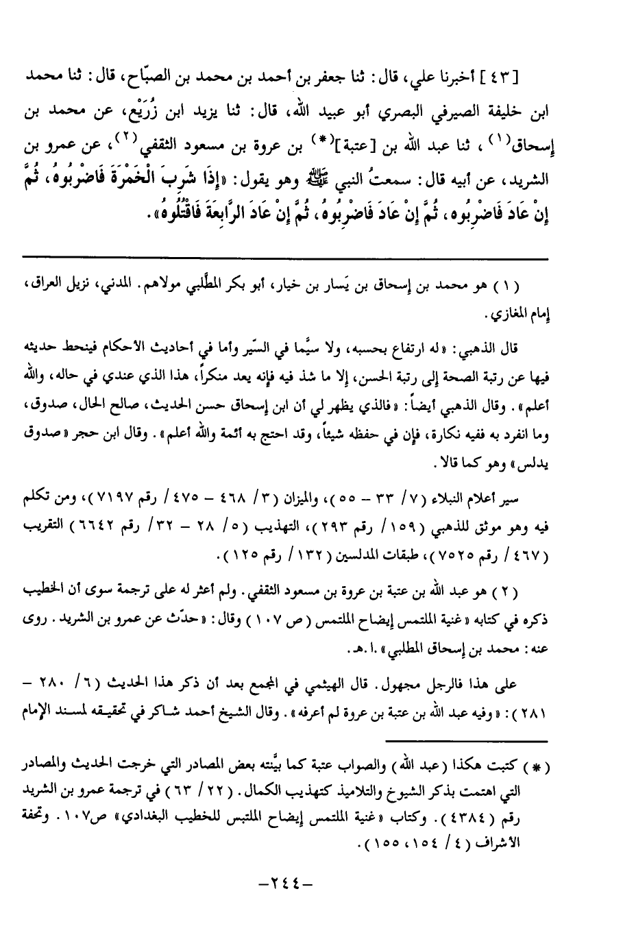 43 - أَخْبَرَنَا عَلِيٌّ قَالَ: ثنا جَعْفَرُ بْنُ أَحْمَدَ بْنِ مُحَمَّدِ بْنِ الصَّبَّاحِ, قَالَ: ثنا مُحَمَّدُ بْنُ خَلِيفَةَ الصَّيْرَفِيُّ الْبَصْرِيُّ أَبُو عُبَيْدِ اللَّهِ, قَالَ: ثنا يَزِيدُ بْنُ زُرَيْعٍ, عَنْ مُحَمَّدِ بْنِ إِسْحَاقَ, ثنا عَبْدُ اللَّهِ بْنُ عُتْبَةَ بْنِ عُرْوَةَ بْنِ مَسْعُودٍ الثَّقَفِيُّ, عَنْ عَمْرِو بْنِ الشَّرِيدِ, عَنْ أَبِيهِ, قَالَ: سَمِعْتُ النَّبِيَّ صَلَّى اللهُ عَلَيْهِ وَسَلَّمَ وَهُوَ يَقُولُ: §" إِذَا شَرِبَ الْخَمْرَةَ فَاضْرِبُوهُ, ثُمَّ إِنْ عَادَ فَاضْرِبُوهُ, ثُمَّ إِنْ عَادَ الرَّابِعَةَ فَاقْتُلُوهُ "