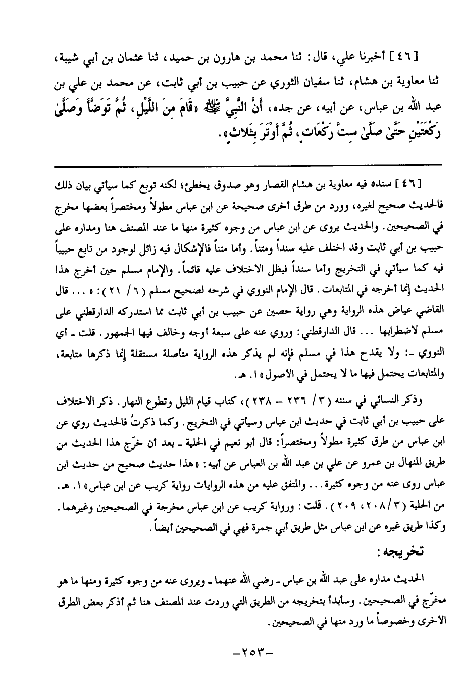 46 - أَخْبَرَنَا عَلِيٌّ قَالَ ثنا مُحَمَّدُ بْنُ هَارُونِ بْنِ حُمَيْدٍ, ثنا عُثْمَانُ بْنُ أَبِي شَيْبَةَ, ثنا مُعَاوِيَةُ بْنُ هِشَامٍ, ثنا سُفْيَانُ الثَّوْرِيُّ, عَنْ حَبِيبِ بْنِ أَبِي ثَابِتٍ, عَنْ مُحَمَّدِ بْنِ عَلِيِّ بْنِ عَبْدِ اللَّهِ بْنِ عَبَّاسٍ, عَنْ أَبِيهِ, عَنْ جَدِّهِ, أَنَّ النَّبِيَّ صَلَّى اللهُ عَلَيْهِ وَسَلَّمَ §قَامَ مِنَ اللَّيْلِ, ثُمَّ تَوَضَّأَ وَصَلَّى رَكْعَتَيْنِ حَتَّى صَلَّى سِتَّ رَكَعَاتٍ, ثُمَّ أَوْتَرَ بِثَلَاثٍ