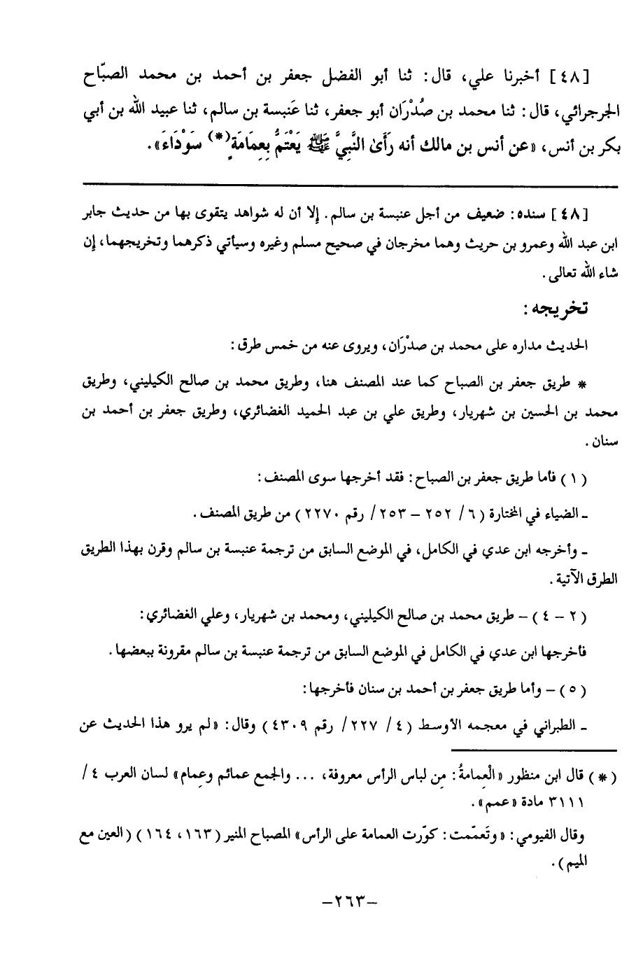 48 - أَخْبَرَنَا عَلِيٌّ قَالَ ثنا أَبُو الْفَضْلِ جَعْفَرُ بْنُ أَحْمَدَ بْنِ مُحَمَّدٍ الصَّبَّاحُ الْجَرْجَرَائِيُّ قَالَ: ثنا مُحَمَّدُ بْنُ صُدْرَانَ أَبُو جَعْفَرٍ, ثنا عَنْبَسَةُ بْنُ سَالِمٍ, ثنا عُبَيْدُ اللَّهِ بْنُ أَبِي بَكْرِ بْنُ أَنَسٍ, عَنْ أَنَسِ بْنِ مَالِكٍ, أَنَّهُ رَأَى النَّبِيَّ صَلَّى اللهُ عَلَيْهِ وَسَلَّمَ §يَعْتَمُّ بِعِمَامَةٍ سَوْدَاءَ