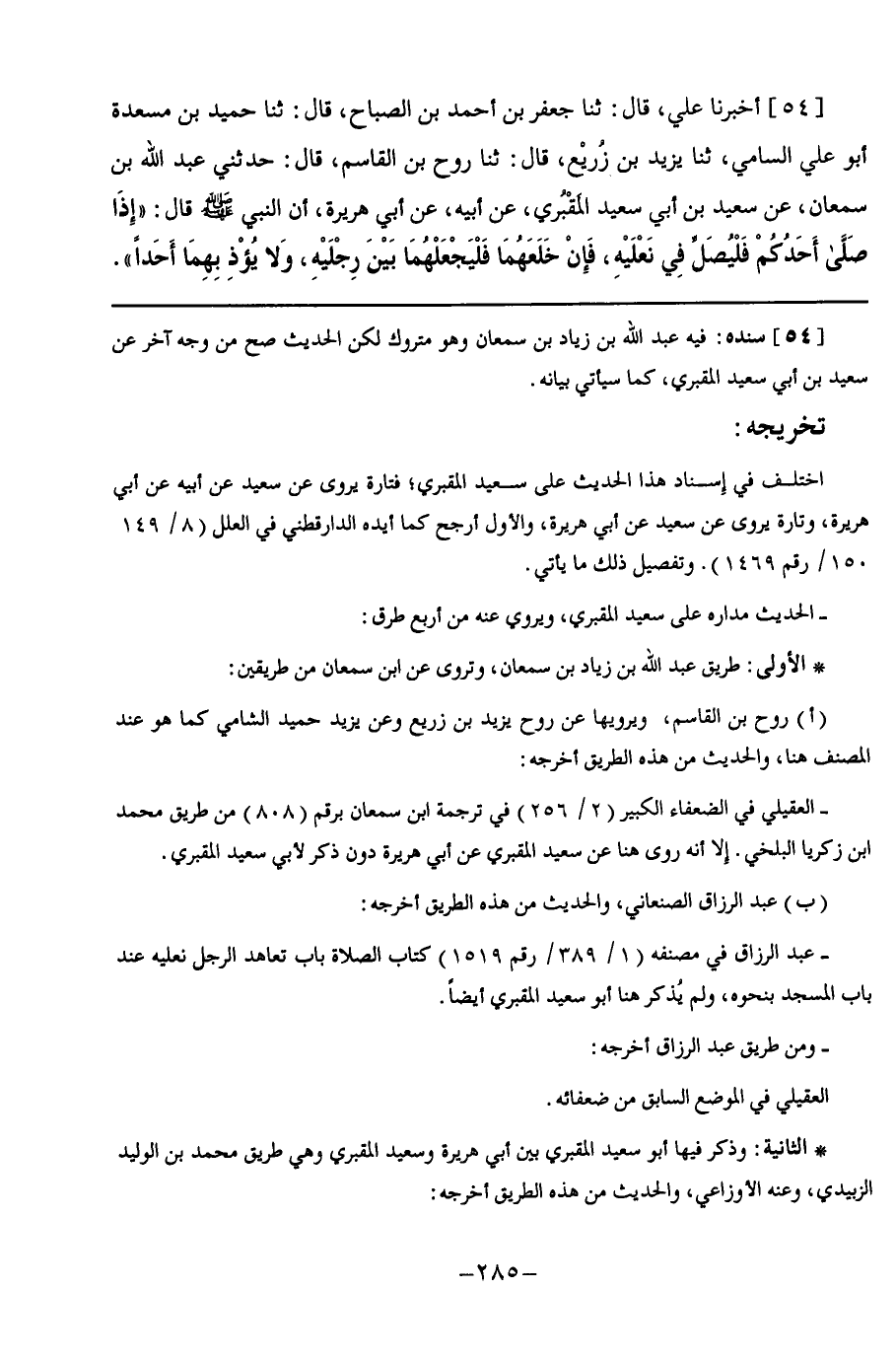 54 - أَخْبَرَنَا عَلِيٌّ قَالَ: ثنا جَعْفَرُ بْنُ أَحْمَدَ بْنِ الصَّبَّاحِ, قَالَ: ثنا حُمَيْدُ بْنُ مَسْعَدَةَ أَبُو عَلِيٍّ السَّامِيُّ, ثنا يزيدُ بْنُ زُرَيْعٍ, قَالَ: ثنا رَوْحُ بْنُ الْقَاسِمِ, قَالَ: حَدَّثَنِي عَبْدُ اللَّهِ بْنُ سَمْعَانَ, عَنْ سَعِيدِ بْنِ أَبِي سَعِيدٍ الْمَقْبُرِيِّ, عَنْ أَبِيهِ, عَنْ أَبِي هُرَيْرَةَ, أَنَّ النَّبِيَّ صَلَّى اللهُ عَلَيْهِ وَسَلَّمَ قَالَ: §" إِذَا صَلَّى أَحَدُكُمْ فَلْيُصَلِّ فِي نَعْلَيْهِ, فَإِنْ خَلَعَهُمَا فَلْيَجْعَلْهُمَا بَيْنَ رِجْلَيْهِ, وَلَا يُؤْذِ بِهِمَا أَحَدًا "