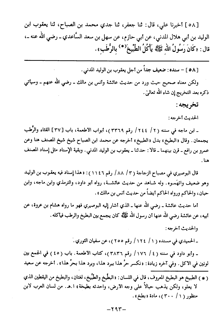 58 - أَخْبَرَنَا عَلِيٌّ قَالَ: ثنا جَعْفَرٌ, ثنا جَدِّي مُحَمَّدُ بْنُ الصَّبَّاحِ, ثنا يَعْقُوبُ بْنُ الْوَلِيدِ بْنِ أَبِي هِلَالٍ الْمَدَنِيُّ, عَنْ أَبِي حَازِمٍ, عَنْ سَهْلِ بْنِ سَعْدٍ السَّاعِدِيِّ رَضِيَ اللَّهُ عَنْهُ قَالَ: كَانَ رَسُولُ اللَّهِ صَلَّى اللهُ عَلَيْهِ وَسَلَّمَ §يَأْكُلُ الْبِطِّيخَ بِالرُّطَبِ