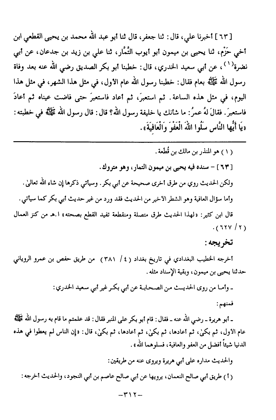 63 - أَخْبَرَنَا عَلِيٌّ قَالَ: ثنا جَعْفَرٌ, قَالَ: ثنا أَبُو عَبْدِ اللَّهِ مُحَمَّدُ بْنُ يَحْيَى الْقُطَعِيُّ ابْنُ أَخِي حَزْمٍ, ثنا يَحْيَى بْنُ مَيْمُونٍ أَبُو أَيُّوبَ التَّمَّارُ, ثنا عَلِيُّ بْنُ زَيْدِ بْنِ جُدْعَانَ, عَنْ أَبِي نَضْرَةَ, عَنْ أَبِي سَعِيدٍ الْخُدْرِيُّ, قَالَ: خَطَبَنَا أَبُو بَكْرٍ الصِّدِّيقُ رَضِيَ اللَّهُ عَنْهُ بَعْدَ وَفَاةِ رَسُولِ اللَّهِ صَلَّى اللهُ عَلَيْهِ وَسَلَّمَ بِعَامٍ فَقَالَ: خَطَبَنَا رَسُولُ اللَّهِ عَامَ الْأَوَّلِ, فِي مِثْلِ هَذَا الشَّهْرِ, فِي مِثْلِ هَذَا الْيَوْمِ, فِي مِثْلِ هَذِهِ السَّاعَةِ, ثُمَّ اسْتَعْبَرَ, ثُمَّ أَعَادَ فَاسْتَعْبَرَ حَتَّى فَاضَتْ عَيْنَاهُ ثُمَّ أَعَادَ فَاسْتَعْبَرَ فَقَالَ لَهُ عُمَرُ: مَا شَأْنُكُ يَا خَلِيفَةَ رَسُولِ اللَّهِ؟ قَالَ: قَالَ رَسُولُ اللَّهِ صَلَّى اللهُ عَلَيْهِ وَسَلَّمَ فِي خُطْبَتِهِ: " يَا أَيُّهَا النَّاسُ §سَلُوا اللَّهَ الْعَفْوَ وَالْعَافِيَةَ "