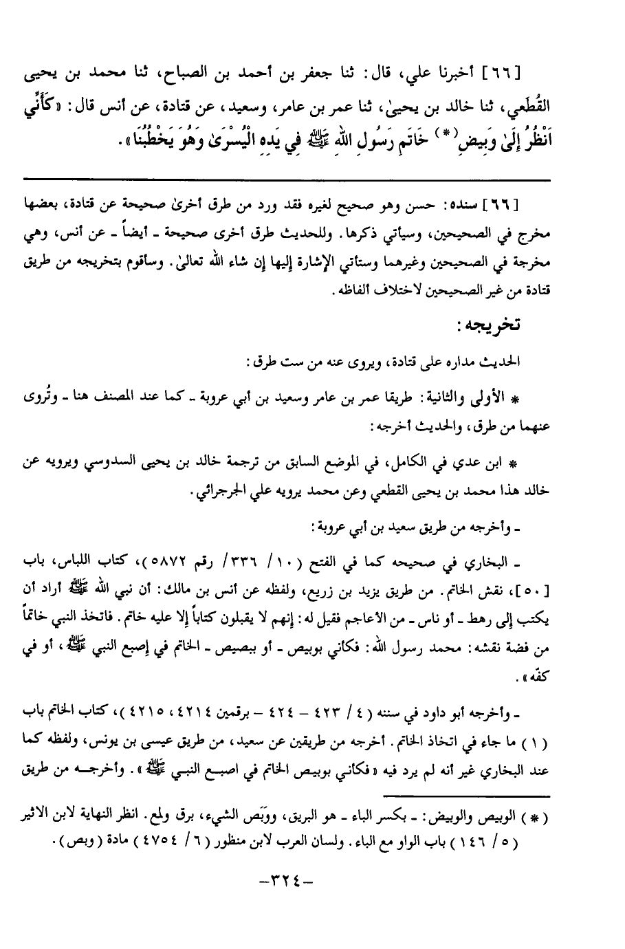 66 - أَخْبَرَنَا عَلِيٌّ قَالَ: ثنا جَعْفَرُ بْنُ أَحْمَدَ بْنِ الصَّبَّاحِ, ثنا مُحَمَّدُ بْنُ يَحْيَى الْقُطَعِيُّ, ثنا خَالِدُ بْنُ يَحْيَى, ثنا عمر بن عَامِر, وَسَعِيدٌ, عَنْ قَتَادَةَ, عَنْ أَنَسٍ, قَالَ: §كَأَنِّي أَنْظُرُ إِلَى وَبِيضِ خَاتَمِ رَسُولِ اللَّهِ صَلَّى اللهُ عَلَيْهِ وَسَلَّمَ فِي يَدِهِ الْيُسْرَى وَهُوَ يَخْطُبُنَا