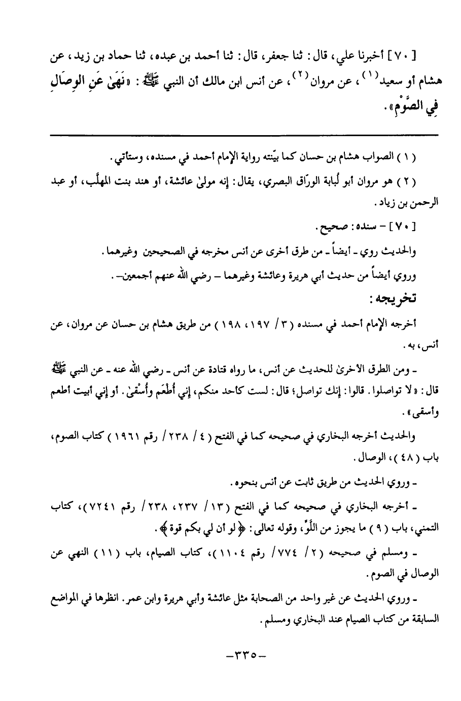 70 - أَخْبَرَنَا عَلِيٌّ قَالَ: ثنا جَعْفَرٌ, قَالَ: ثنا أَحْمَدُ بْنُ عَبْدَةَ, ثنا حَمَّادُ بْنُ زَيْدٍ, عَنْ هِشَامٍ أَوْ سَعِيدٍ, عَنْ مَرْوَانَ, عَنْ أَنَسِ بْنِ مَالِكٍ, أَنَّ النَّبِيَّ صَلَّى اللهُ عَلَيْهِ وَسَلَّمَ §نَهَى عَنِ الْوِصَالِ فِي الصَّوْمِ