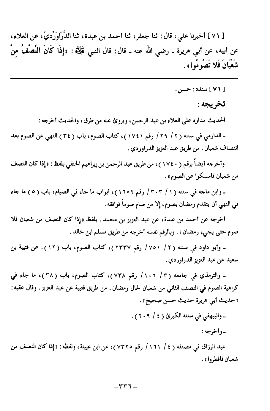 71 - أَخْبَرَنَا عَلِيٌّ قَالَ: ثنا جَعْفَرٌ, ثنا أَحْمَدُ بْنُ عَبْدَةَ, ثنا الدَّرَاوَرْدِيُّ, عَنِ الْعَلَاءِ, عَنْ أَبِيهِ, عَنْ أَبِي هُرَيْرَةَ, رَضِيَ اللَّهُ عَنْهُ قَالَ: قَالَ النَّبِيُّ صَلَّى اللهُ عَلَيْهِ وَسَلَّمَ: §" إِذَا كَانَ النِّصْفُ مِنْ شَعْبَانَ فَلَا تَصُومُوا "