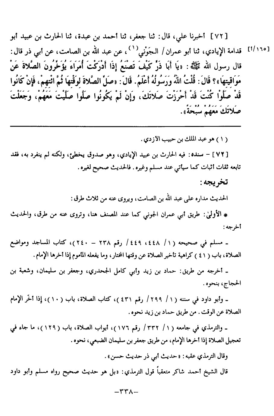 72 - أَخْبَرَنَا عَلِيٌّ قَالَ: ثنا جَعْفَرٌ, ثنا أَحْمَدُ بْنُ عَبْدَةَ, ثنا الْحَارِثُ بْنُ عُبَيْدٍ أَبُو قُدَامَةَ الْإِيَادِيُّ, ثنا أَبُو عِمْرَانَ الْجَوْنِيُّ, عَنْ عَبْدِ اللَّهِ بْنِ الصَّامِتِ, عَنْ أَبِي ذَرٍّ, قَالَ: قَالَ رَسُولُ اللَّهِ صَلَّى اللهُ عَلَيْهِ وَسَلَّمَ: " يَا أَبَا ذَرٍّ كَيْفَ تَصْنَعُ إِذَا أَدْرَكْتَ أُمَرَاءَ يُؤَخِّرُونَ الصَّلَاةَ عَنْ مَوَاقِيتِهَا ". قَالَ: قُلْتُ اللَّهُ وَرَسُولُهُ أَعْلَمُ. قَالَ: §" صَلِّ الصَّلَاةَ لِوَقْتِهَا, ثُمَّ ائْتِهِمْ فَإِنْ كَانُوا قَدْ صَلُّوا كُنْتَ قَدْ أَحْرَزْتَ صَلَاتَكَ, وَإِنْ لَمْ يَكُونُوا صَلُّوا صَلَّيْتَ مَعَهُمْ وَجَعَلْتَ صَلَاتَكَ مَعَهُمْ سُبْحَةً "
