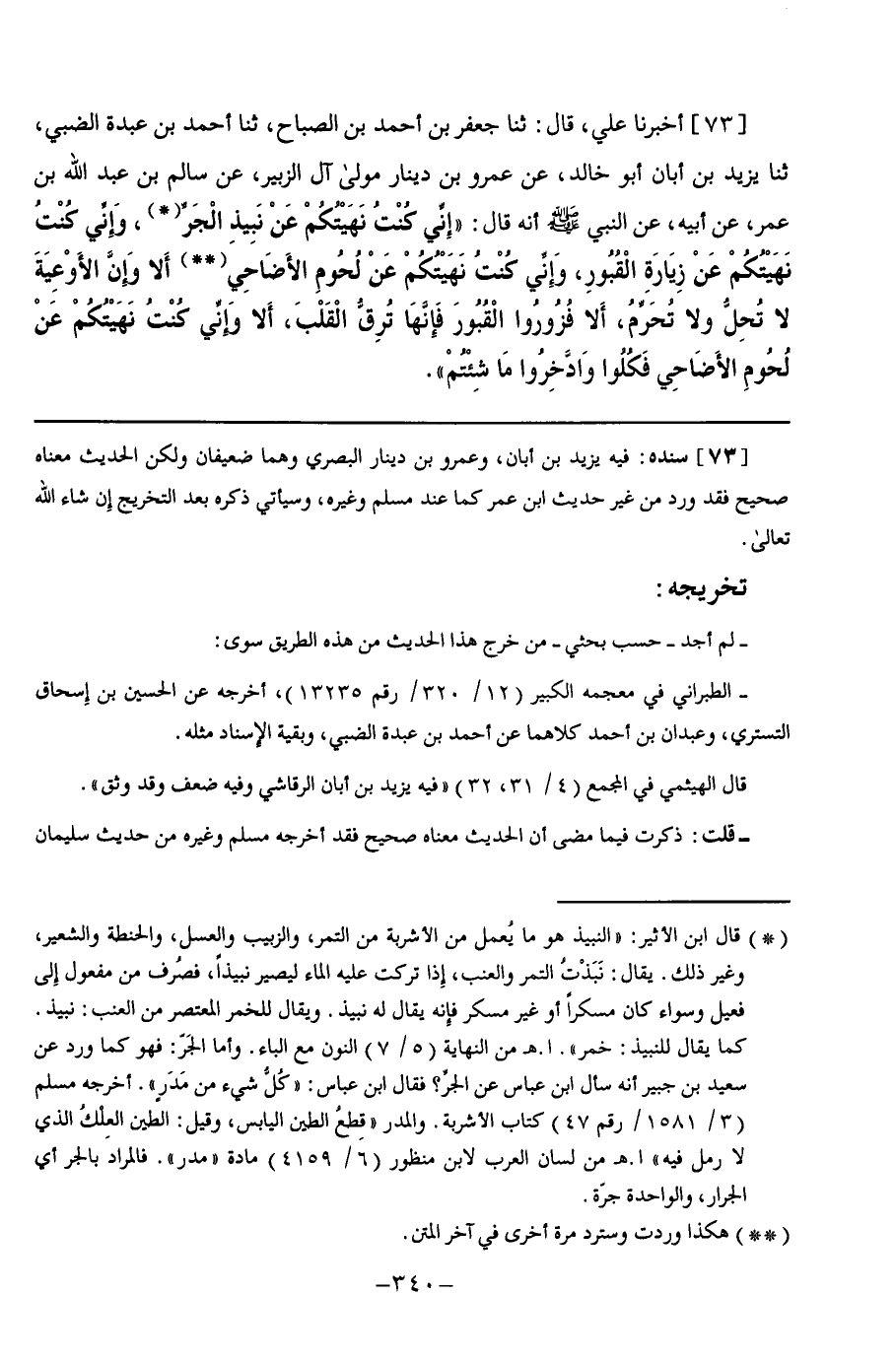 73 - أَخْبَرَنَا عَلِيٌّ قَالَ: ثنا جَعْفَرُ بْنُ أَحْمَدَ بْنِ الصَّبَّاحِ, ثنا أَحْمَدُ بْنُ عَبْدَةَ الضَّبِّيُّ, ثنا يَزِيدُ بْنُ أَبَانَ أَبُو خَالِدٍ, عَنْ عَمْرِو بْنِ دِينَارٍ مَوْلَى آلِ الزُّبَيْرِ عَنْ سَالِمِ بْنِ عَبْدِ اللَّهِ بْنِ عُمَرَ, عَنْ أَبِيهِ, عَنِ النَّبِيِّ صَلَّى اللهُ عَلَيْهِ وَسَلَّمَ أَنَّهُ قَالَ: " إِنِّي كُنْتُ §نَهَيْتُكُمْ عَنْ نَبِيذِ الْجَرِّ، وَإِنِّي كُنْتُ نَهَيْتُكُمْ عَنْ زِيَارَةِ الْقُبُورِ، وَإِنِّي كُنْتُ نَهَيْتُكُمْ عَنْ لُحُومِ الْأَضَاحِي، أَلَا وَإِنَّ الْأَوْعِيَةَ لَا تُحِلُّ وَلَا تُحَرِّمُ, أَلَا فَزُورُوا الْقُبُورَ, فَإِنَّهَا تُرِقُّ الْقَلْبَ, أَلَا وَإِنِّي كُنْتُ نَهَيْتُكُمْ عَنْ لُحُومِ الْأَضَاحِي فَكُلُوا وَادَّخِرُوا مَا شِئْتُمْ "