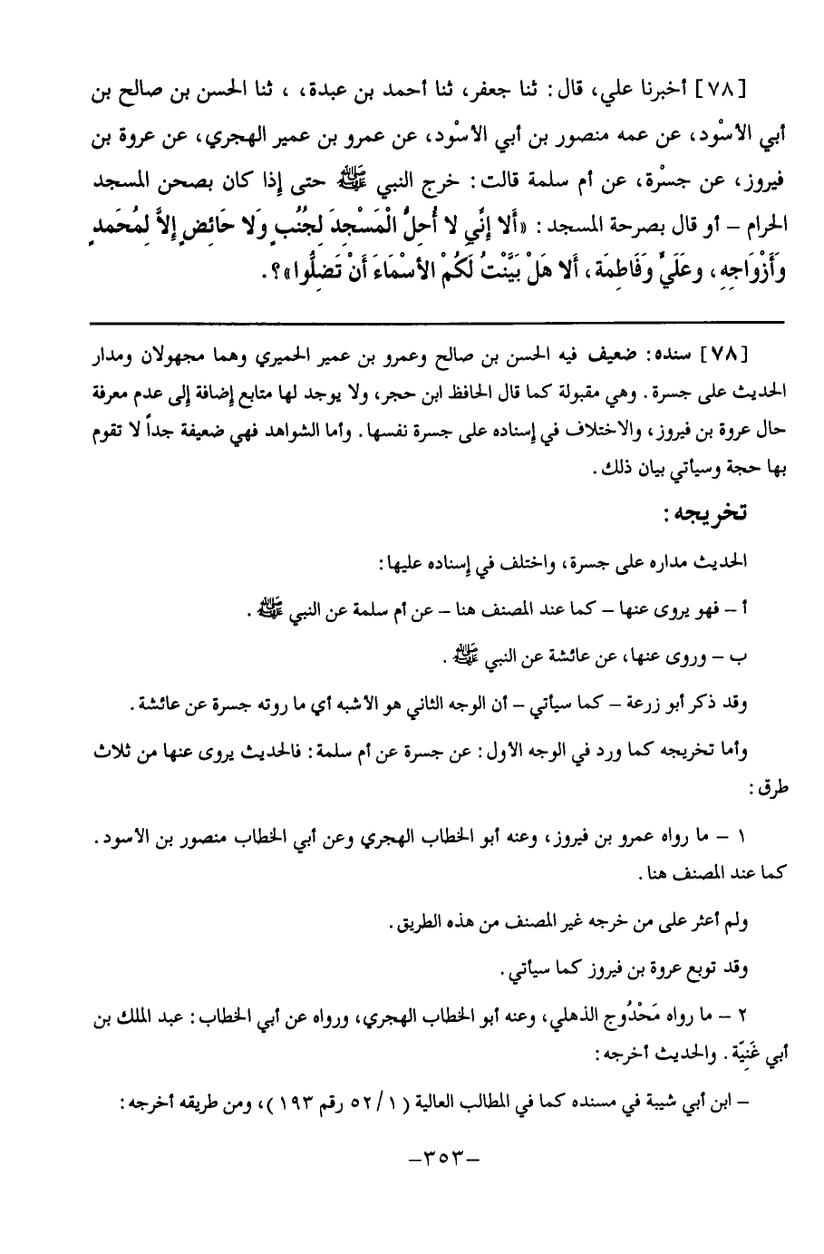 78 - أَخْبَرَنَا عَلِيٌّ قَالَ: ثنا جَعْفَرٌ, ثنا أَحْمَدُ بْنُ عَبْدَةَ, ثنا الْحَسَنُ بْنُ صَالِحِ بْنِ أَبِي الْأَسْوَدِ, عَنْ عَمِّهِ مَنْصُورِ بْنِ أَبِي الْأَسْوَدِ, عَنْ عَمْرِو بْنِ عُمَيْرٍ الْهَجَرِيِّ, عَنْ عُرْوَةَ بْنِ فَيْرُوزَ, عَنْ جَسْرَةَ, عَنْ أُمِّ سَلَمَةَ, قَالَتْ: خَرَجَ النَّبِيُّ صَلَّى اللهُ عَلَيْهِ وَسَلَّمَ حَتَّى إِذَا كَانَ بِصَحْنِ الْمَسْجِدِ الْحَرَامِ - أَوْ قَالَ بِصَرْحَةِ الْمَسْجِدِ -: §" أَلَا إِنِّي لَا أُحِلُّ الْمَسْجِدَ لِجُنُبٍ وَلَا حَائِضٍ إِلَّا لِمُحَمَّدٍ وَأَزْوَاجِهِ, وَعَلِيٍّ وَفَاطِمَةَ, أَلَا هَلْ بَيَّنْتُ لَكُمُ الْأَسْمَاءَ أَنْ تَضِلُّوا؟ "