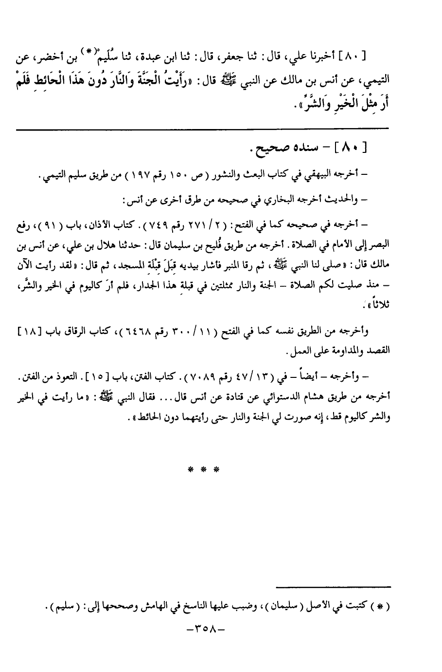 80 - أَخْبَرَنَا عَلِيٌّ قَالَ: ثنا جَعْفَرٌ قَالَ: ثنا ابْنُ عَبْدَةَ, ثنا سُلَيْمُ بْنُ أَخْضَرَ, عَنِ التَّيْمِيِّ, عَنْ أَنَسِ بْنِ مَالِكٍ, عَنِ النَّبِيِّ صَلَّى اللهُ عَلَيْهِ وَسَلَّمَ قَالَ: §" رَأَيْتُ الْجَنَّةَ وَالنَّارَ دُونَ هَذَا الْحَائِطَ فَلَمْ أَرَ مِثْلَ الْخَيْرِ وَالشَّرِّ "