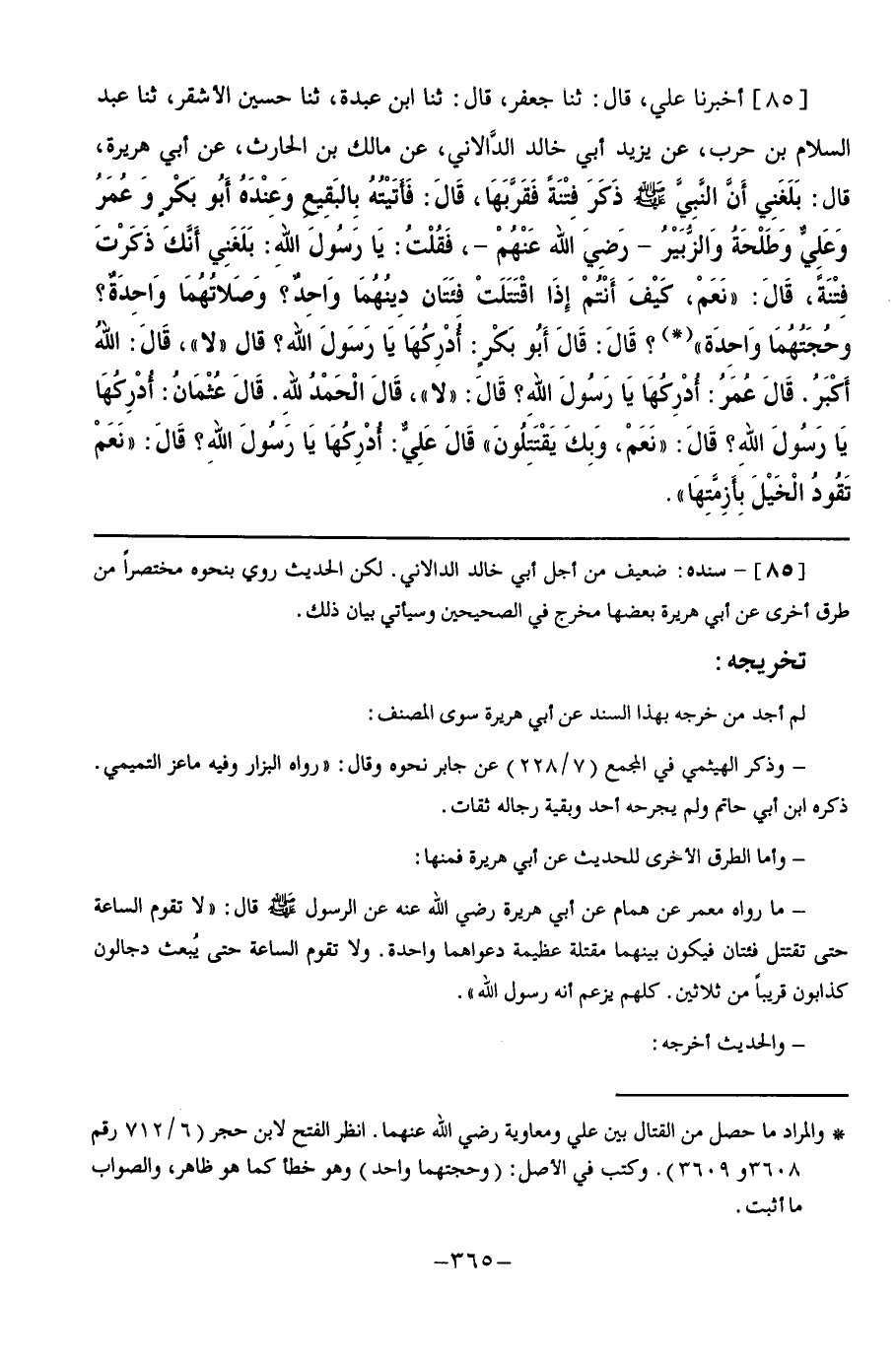 85 - أَخْبَرَنَا عَلِيٌّ قَالَ: ثنا جَعْفَرٌ, قَالَ: ثنا ابْنُ عَبْدَةَ, ثنا حُسَيْنُ الْأَشْقَرُ, ثنا عَبْدُ السَّلَامِ بْنُ حَرْبٍ, عَنْ يَزِيدَ أَبِي خَالِدٍ الدَّالَانِيِّ, عَنْ مَالِكِ بْنِ الْحَارِثِ, عَنْ أَبِي هُرَيْرَةَ, قَالَ: بَلَغَنِي أَنَّ النَّبِيَّ صَلَّى اللهُ عَلَيْهِ وَسَلَّمَ ذَكَرَ فِتْنَةً فَقَرَّبَهَا, قَالَ: فَأَتَيْتُهُ بِالْبَقِيعِ وَعِنْدَهُ أَبُو بَكْرٍ وَعُمَرَ وَعَلِيٍّ وَطَلْحَةَ بْنِ الزُّبَيْرِ - رَضِيَ اللَّهُ عَنْهُمْ - فَقُلْتُ: يَا رَسُولَ اللَّهِ: بَلَغَنِي أَنَّكَ ذَكَرْتَ فِتْنَةً قَالَ: " نَعَمْ, كَيْفَ أَنْتُمْ إِذَا اقْتَتَلْتُمْ فِئَتَانِ دِينُهُمَا وَاحِدٌ؟ وَصَلَاتُهُمَا وَاحِدَةٌ؟ وَحُجَّتُهُمَا وَاحِدَةٌ؟ " قَالَ: قَالَ أَبُو بَكْرٍ: أُدْرِكُهَا يَا رَسُولَ اللَّهِ؟ قَالَ: " لَا ". قَالَ: اللَّهُ أَكْبَرُ, قَالَ عُمَرُ: أُدْرِكُهَا يَا رَسُولَ اللَّهِ؟ قَالَ: " لَا ". قَالَ: الْحَمْدُ لِلَّهِ, قَالَ عُثْمَانُ: أُدْرِكُهَا يَا رَسُولَ اللَّهِ؟ قَالَ: " نَعَمْ, وَبِكَ يَقْتَتِلُونَ ". قَالَ عَلِيٌّ: أُدْرِكُهَا يَا رَسُولَ اللَّهِ؟ قَالَ: " نَعَمْ, §تَقُودُ الْخَيْلَ بِأَزِمَّتِهَا "