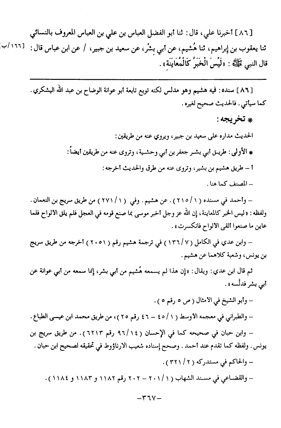 86 - أَخْبَرَنَا عَلِيٌّ قَالَ: ثنا أَبُو الْفَضْلِ الْعَبَّاسُ بْنُ عَلِيِّ بْنِ الْعَبَّاسِ الْمَعْرُوفُ بِالنِّسَائِيِّ, ثنا يَعْقُوبُ بْنُ إِبْرَاهِيمَ, ثنا هُشَيْمٌ, عَنْ أَبِي بِشْرٍ, عَنْ سَعِيدِ بْنِ جُبَيْرٍ, عَنِ ابْنِ عَبَّاسٍ, قَالَ: قَالَ النَّبِيُّ صَلَّى اللهُ عَلَيْهِ وَسَلَّمَ: §" لَيْسَ الْخَبَرُ كَالْمُعَايَنَةِ "