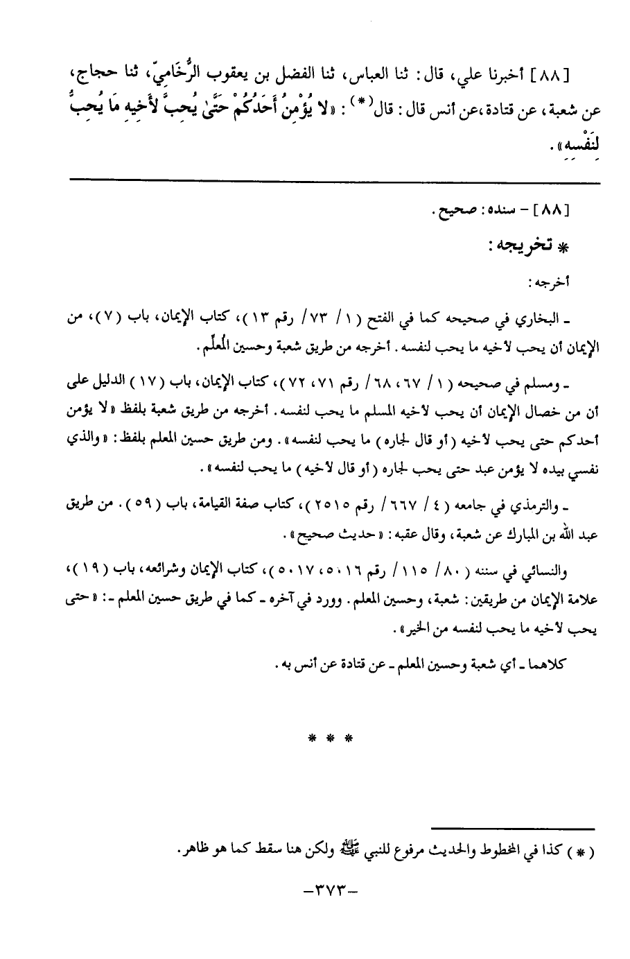 88 - أَخْبَرَنَا عَلِيٌّ قَالَ: ثنا الْعَبَّاسُ, ثنا الْفَضْلُ بْنُ يَعْقُوبَ الرُّخَامِيُّ, ثنا حَجَّاجٌ, عَنْ شُعْبَةَ, عَنْ قَتَادَةَ, عَنْ أَنَسٍ, قَالَ: قَالَ §" لَا يُؤْمِنُ أَحَدُكُمْ حَتَّى يُحِبَّ لِأَخِيهِ مَا يُحِبُّ لِنَفْسِهِ "