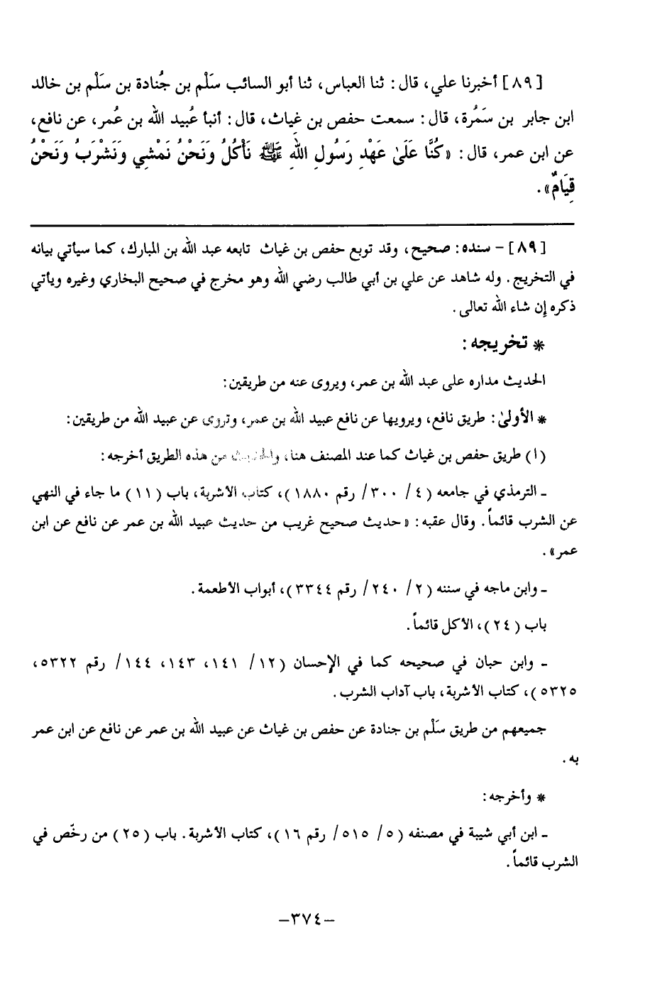 89 - أَخْبَرَنَا عَلِيٌّ قَالَ: ثنا الْعَبَّاسُ, ثنا أَبُو السَّائِبٍ سَلْمُ بْنُ جُنَادَةَ بْنِ سَلْمِ بْنِ خَالِدِ بْنِ جَابِرِ بْنِ سَمُرَةَ قَالَ: سَمِعْتُ حَفْصَ بْنَ غِيَاثٍ, قَالَ: أَنْبَأَ عُبَيْدُ اللَّهِ بْنُ عُمَرَ, عَنْ نَافِعٍ, عَنِ ابْنِ عُمَرَ, قَالَ: كُنَّا عَلَى عَهْدِ رَسُولِ اللَّهِ صَلَّى اللهُ عَلَيْهِ وَسَلَّمَ §نَأْكُلُ وَنَحْنُ نَمْشِي وَنَشْرَبُ وَنَحْنُ قِيَامٌ