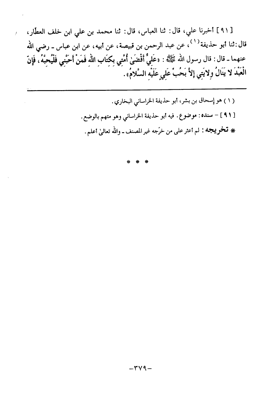 91 - أَخْبَرَنَا عَلِيٌّ قَالَ: ثنا الْعَبَّاسُ قال: ثنا مُحَمَّدُ بْنُ عَلِيِّ بْنِ خَلَفٍ الْعَطَّارُ, قَالَ: ثنا أَبُو حُذَيْفَةَ, عَنْ عَبْدِ الرَّحْمَنِ بْنِ قَبِيصَةَ, عَنْ أَبِيهِ, عَنِ ابْنِ عَبَّاسٍ, - رَضِيَ اللَّهُ عَنْهُمَا - قَالَ: قَالَ رَسُولُ اللَّهِ صَلَّى اللهُ عَلَيْهِ وَسَلَّمَ: §" عَلِيٌّ أَقْضَى أُمَّتِي بِكِتَابِ اللَّهِ فَمَنْ أَحَبَّنِي فَلْيُحِبَّهُ, فَإِنَّ الْعَبْدَ لَا يَنَالُ وِلَايَتِي إِلَّا بِحُبِّ عَلِيٍّ عَلَيْهِ السَّلَامُ "