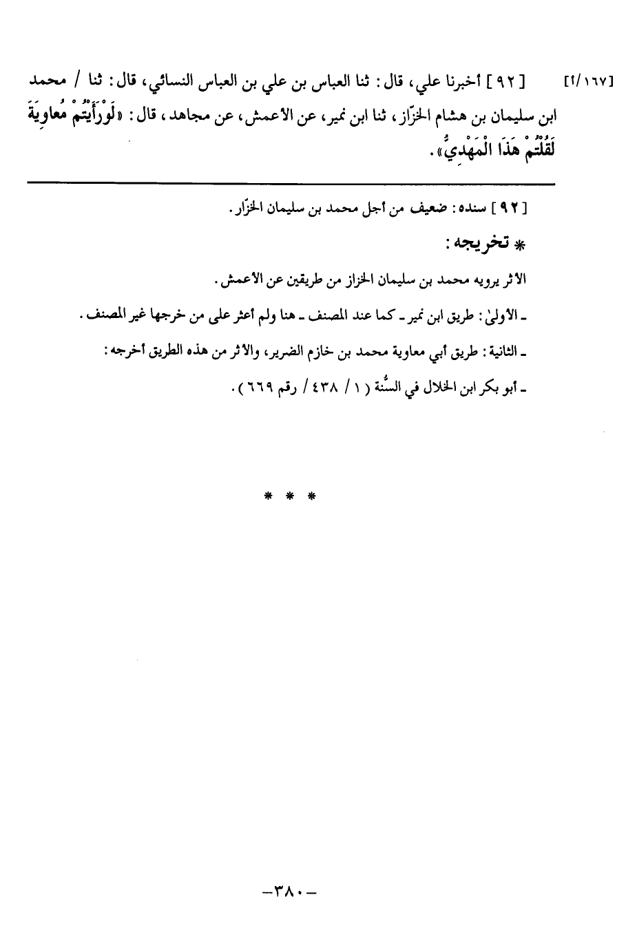 92 - أَخْبَرَنَا عَلِيٌّ قَالَ: ثنا الْعَبَّاسُ بْنُ عَلِيِّ بْنِ الْعَبَّاسِ النَّسَائِيُّ, قَالَ: ثنا مُحَمَّدُ بْنُ سُلَيْمَانَ بْنِ هِشَامٍ الْخَزَّازُ, ثنا ابْنُ نُمَيْرٍ, عَنِ الْأَعْمَشِ, عَنْ مُجَاهِدٍ, قَالَ: §" لَوْ رَأَيْتُمْ مُعَاوِيَةَ لَقُلْتُمْ هَذَا الْمَهْدِيُّ "