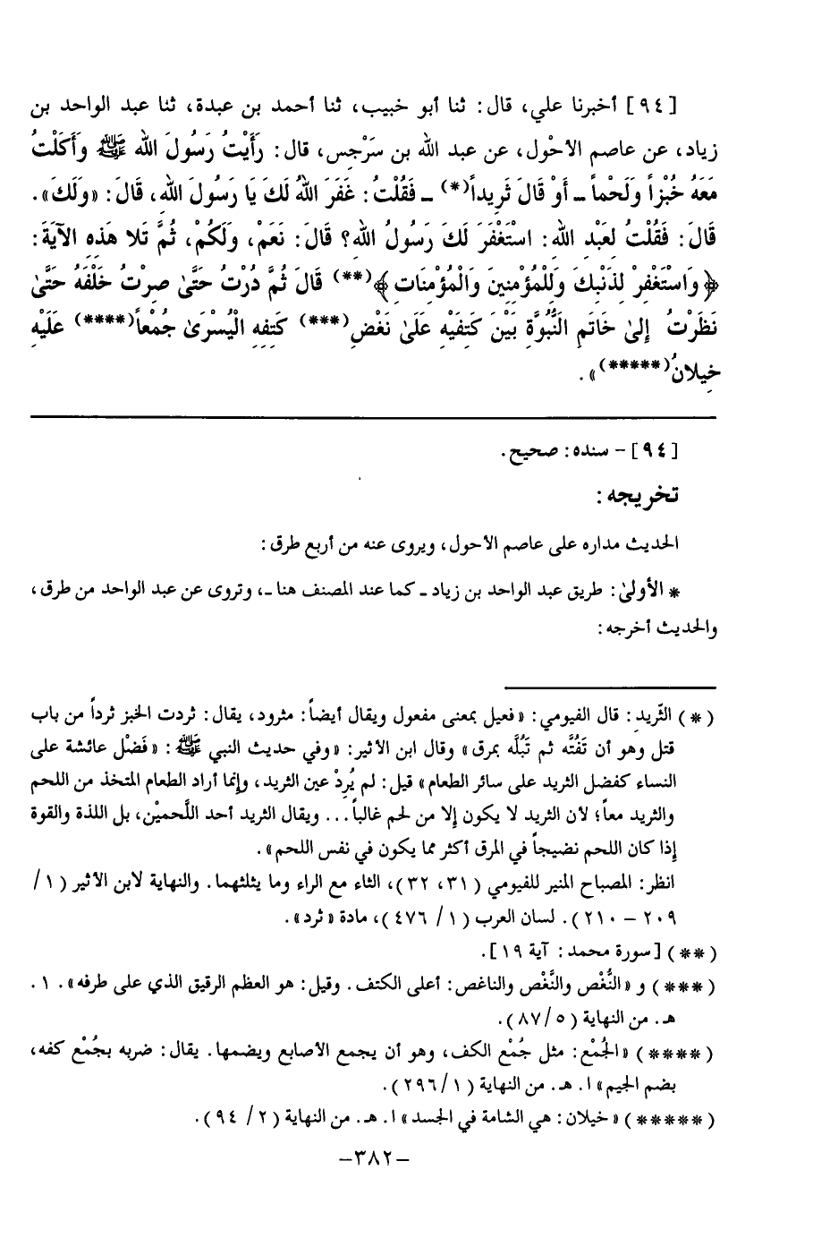 94 - أَخْبَرَنَا عَلِيٌّ قَالَ: ثنا أَبُو خُبَيْبٍ, ثنا أَحْمَدُ بْنُ عَبْدَةَ, ثنا عَبْدُ الْوَاحِدِ بْنُ زِيَادٍ, عَنْ عَاصِمٍ الْأَحْوَلِ, عَنْ عَبْدِ اللَّهِ بْنِ سَرْجِسٍ, قَالَ: رَأَيْتُ رَسُولَ اللَّهِ صَلَّى اللهُ عَلَيْهِ وَسَلَّمَ §وَأَكَلْتُ مَعَهُ خُبْزًا وَلَحْمًا - أَوْ قَالَ: ثَرِيدًا - فَقُلْتُ: غَفَرَ اللَّهُ لَكَ يَا رَسُولَ اللَّهِ قَالَ: " وَلَكَ " قَالَ: فَقُلْتُ لِعَبْدِ اللَّهِ: اسْتَغْفَرَ لَكَ رَسُولُ اللَّهِ؟ قَالَ: نَعَمْ, وَلَكُمْ, ثُمَّ تَلَا هَذِهِ الْآيَةِ: {وَاسْتَغْفِرْ لِذَنْبِكَ وَلِلْمُؤْمِنِينَ وَالْمُؤْمِنَاتِ} [محمد: 19] قَالَ: ثُمَّ دُرْتُ حَتَّى صِرْتُ خَلْفَهُ حَتَّى نَظَرْتُ إِلَى خَاتَمِ النُّبُوَّةِ بَيْنَ كَتِفَيْهِ عَلَى نَغْضِ كَتِفِهِ الْيُسْرَى جُمْعًا عَلَيْهِ خِيلَانُ