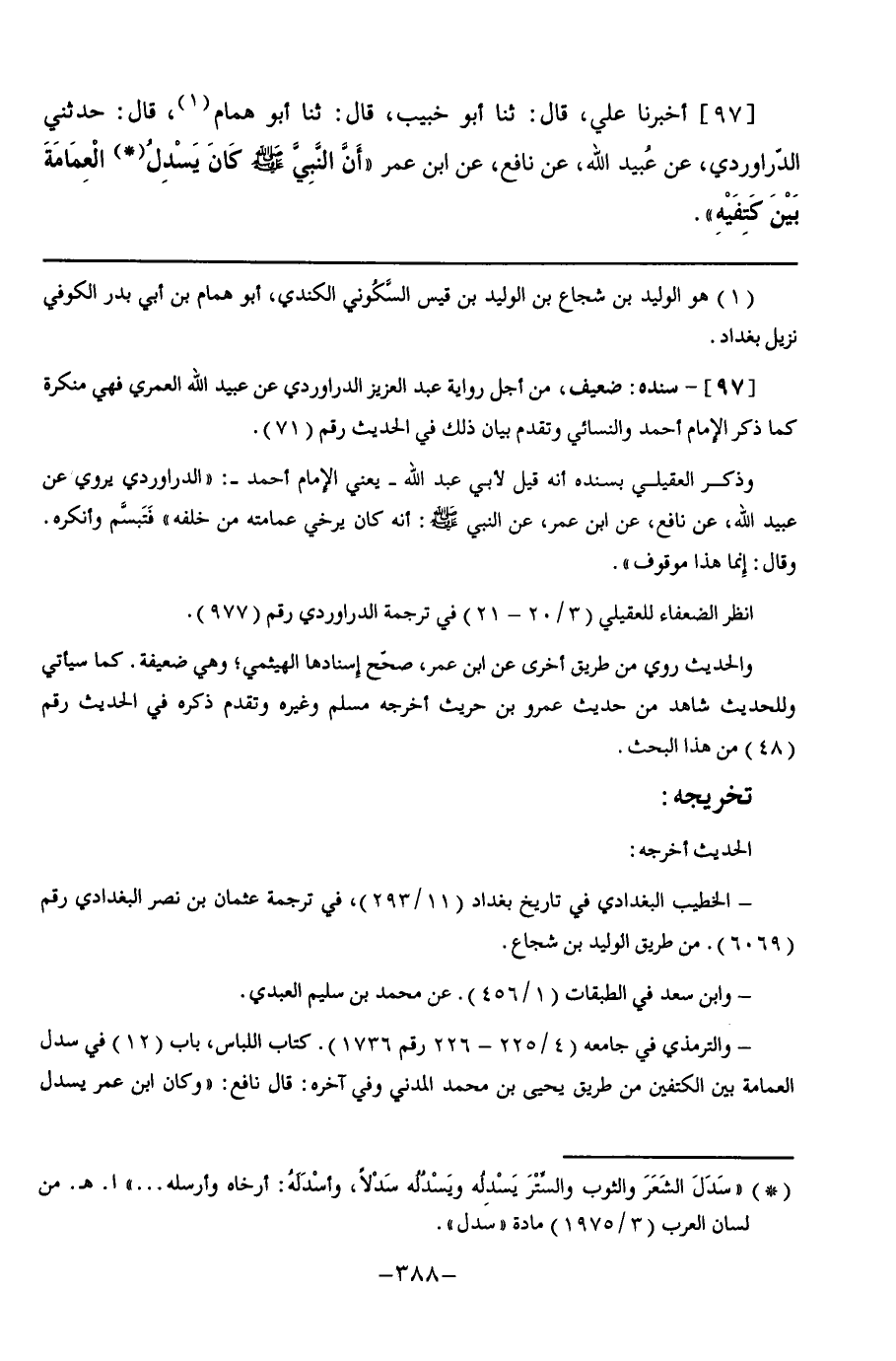 97 - أَخْبَرَنَا عَلِيٌّ قَالَ: ثنا أَبُو خُبَيْبٍ, قَالَ: ثنا أَبُو هَمَّامٍ, قَالَ: حَدَّثَنِي الدَّرَاوَرْدِيُّ, عَنْ عُبَيْدِ اللَّهِ, عَنْ نَافِعٍ, عَنِ ابْنِ عُمَرَ, أَنَّ النَّبِيَّ صَلَّى اللهُ عَلَيْهِ وَسَلَّمَ §كَانَ يَسْدِلُ الْعِمَامَةَ بَيْنَ كَتِفَيْهِ