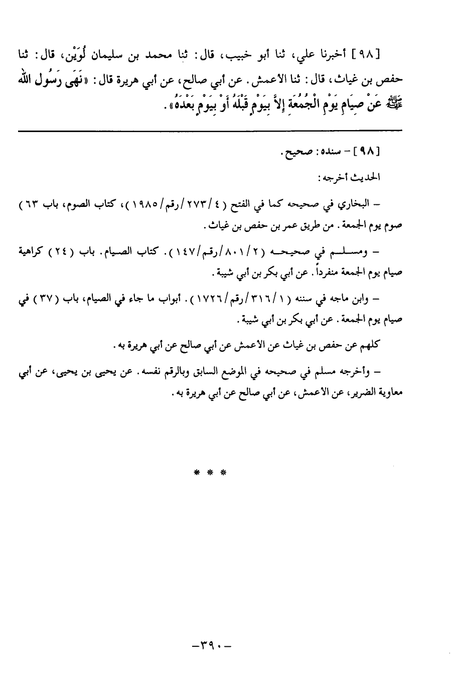 98 - أَخْبَرَنَا عَلِيٌّ: ثنا أَبُو خُبَيْبٍ, قَالَ: ثنا مُحَمَّدُ بْنُ سُلَيْمَانَ لُوَيْنٌ قَالَ: ثنا حَفْصُ بْنُ غِيَاثٍ, قَالَ: ثنا الْأَعْمَشُ, عَنْ أَبِي صَالِحٍ, عَنْ أَبِي هُرَيْرَةَ, قَالَ: نَهَى رَسُولُ اللَّهِ صَلَّى اللهُ عَلَيْهِ وَسَلَّمَ عَنْ §صِيَامِ يَوْمِ الْجُمُعَةِ إِلَّا بِيَوْمٍ قَبْلَهُ أَوْ بِيَوْمٍ بَعْدَهُ