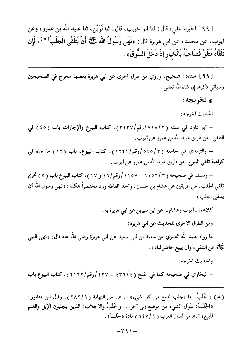 99 - أَخْبَرَنَا عَلِيٌّ قَالَ: ثنا أَبُو خُبَيْبٍ, قَالَ: ثنا لُوَيْنٌ, ثنا عُبَيْدُ اللَّهِ بْنُ عَمْرٍو, وَعَنْ أَيُّوبَ, عَنْ مُحَمَّدٍ, عَنْ أَبِي هُرَيْرَةَ, قَالَ: نَهَى رَسُولُ اللَّهِ صَلَّى اللهُ عَلَيْهِ وَسَلَّمَ أَنْ §يُتَلَقَّى الْجَلَبُ, فَإِنْ تَلَقَّاهُ مُتَلَقٍّ فَصَاحِبُهُ بِالْخِيَارِ إِذَا دَخَلَ السُّوقَ