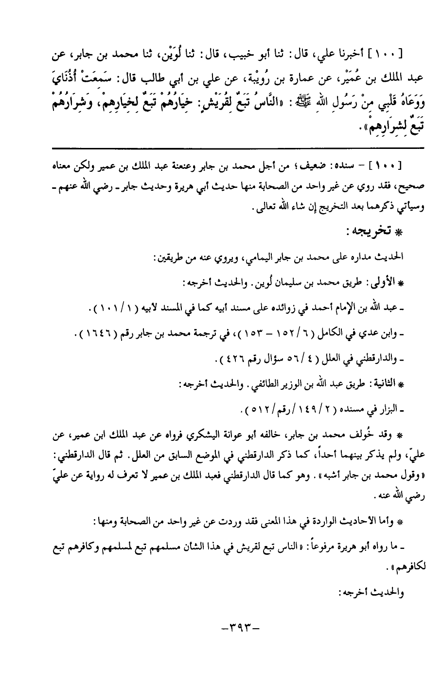 100 - أَخْبَرَنَا عَلِيٌّ قَالَ: ثنا أَبُو خُبَيْبٍ, قَالَ: ثنا لُوَيْنٌ, ثنا مُحَمَّدُ بْنُ جَابِرٍ, عَنْ عَبْدِ الْمَلِكِ بْنِ عُمَيْرٍ, عَنْ عُمَارَةَ بْنِ رُوَيْبَةَ, عَنْ عَلِيِّ بْنِ أَبِي طَالِبٍ, قَالَ: سَمِعَتْ أُذُنَايَ, وَوَعَاهُ, قَلْبِي مِنْ رَسُولِ اللَّهِ صَلَّى اللهُ عَلَيْهِ وَسَلَّمَ: §" النَّاسُ تَبَعٌ لِقُرَيْشٍ, خِيَارُهُمْ تَبَعٌ لِخِيَارِهِمْ, وَشِرَارُهُمْ تَبَعٌ لِشِرَارِهِمْ "