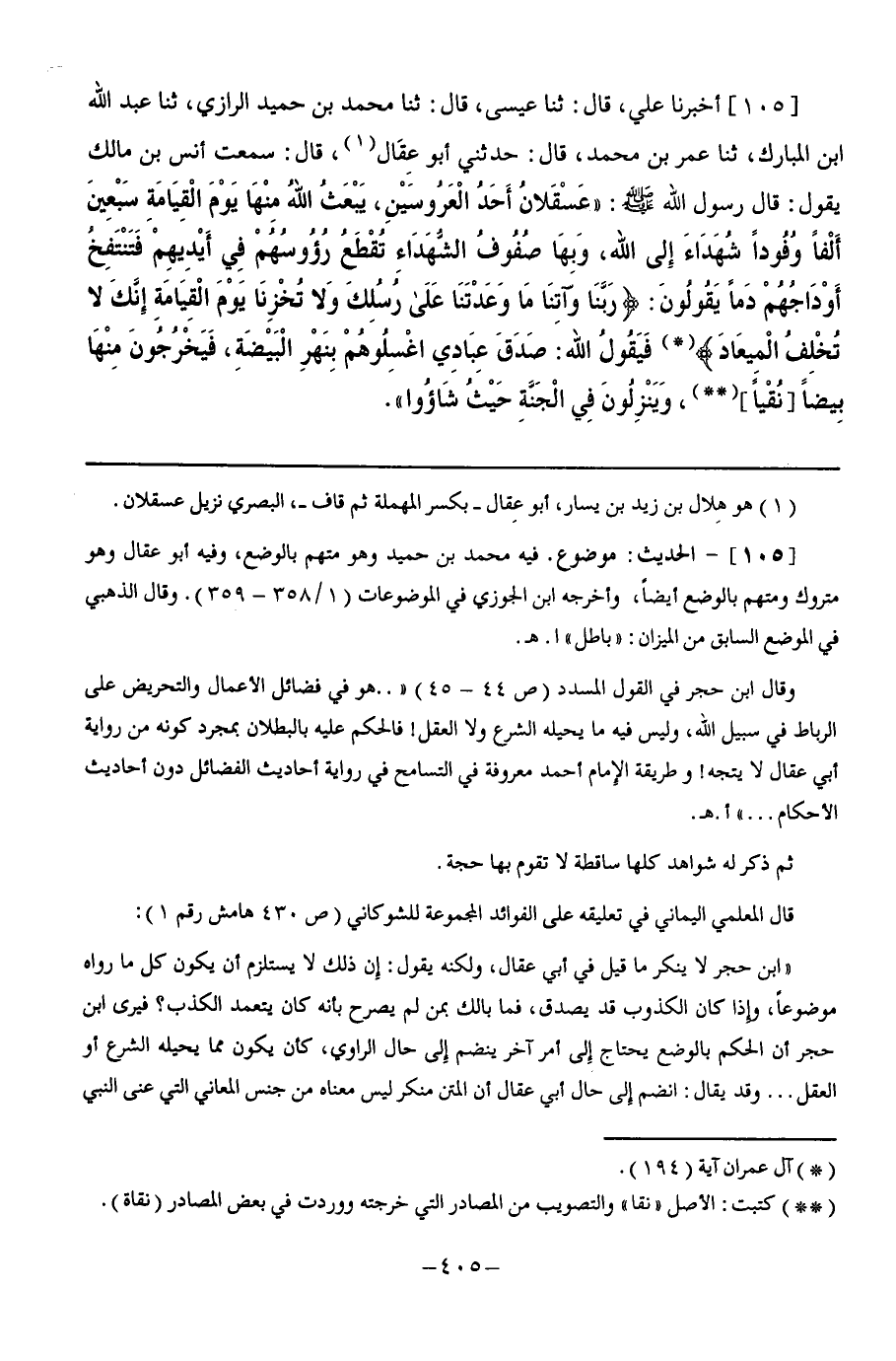 105 - أَخْبَرَنَا عَلِيٌّ قَالَ: ثنا عِيسَى, قَالَ: ثنا مُحَمَّدُ بْنُ حُمَيْدٍ الرَّازِيُّ, ثنا عَبْدُ اللَّهِ بْنُ الْمُبَارَكِ, ثنا عُمَرُ بْنُ مُحَمَّدٍ, قَالَ: حَدَّثَنِي أَبُو عِقَالٍ, قَالَ: سَمِعْتُ أَنَسَ بْنَ مَالِكٍ, يَقُولُ: قَالَ رَسُولُ اللَّهِ صَلَّى اللهُ عَلَيْهِ وَسَلَّمَ: §" عَسْقَلَانُ أَحَدُ الْعَرُوسَيْنِ, يَبْعَثُ اللَّهُ مِنْهَا يَوْمَ الْقِيَامَةِ سَبْعِينَ أَلْفًا وُفُودًا شُهَدَاءَ إِلَى اللَّهِ, وَبِهَا صُفُوفُ الشُّهَدَاءِ تُقْطَعُ رُءُوسُهُمْ فِي أَيْدِيهِمْ فَتَنْتَفِخُ أَوْدَاجُهُمْ دَمًا يَقُولُونَ: {رَبَّنَا وَآتِنَا مَا وَعَدْتَنَا عَلَى رُسُلِكَ, وَلَا تُخْزِنَا يَوْمَ الْقِيَامَةِ إِنَّكَ لَا تَخَلَّفُ الْمِيعَادَ} [آل عمران: 194] فَيَقُولُ اللَّهُ: صَدَقَ عِبَادِي اغْسِلُوهُمْ بِنَهَرِ الْبَيْضَةِ, فَيَخْرُجُونَ مِنْهَا بِيضًا نُقْيًا, وَيَنْزِلُونَ فِي الْجَنَّةِ حَيْثُ شَاؤُوا "