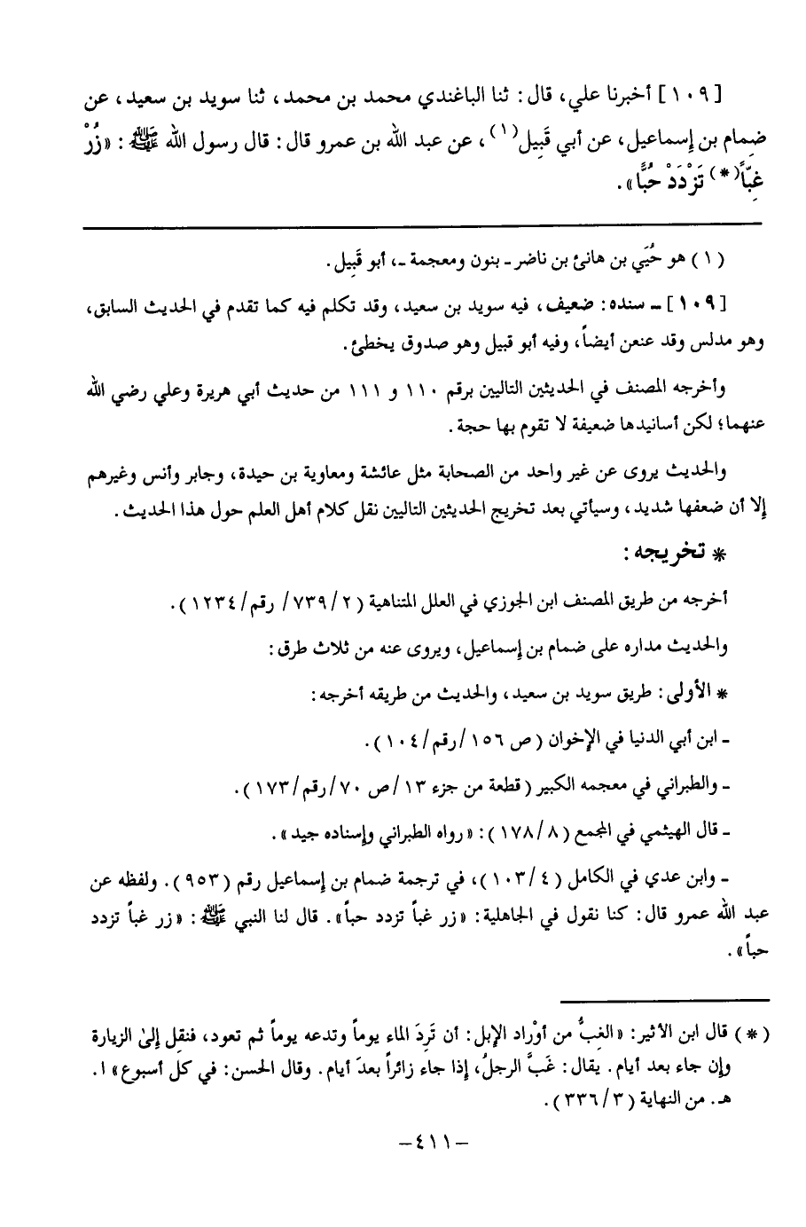 109 - أَخْبَرَنَا عَلِيٌّ قَالَ: ثنا الْبَاغَنْدِيُّ مُحَمَّدُ بْنُ مُحَمَّدٍ ثنا سُوَيْدُ بْنُ سَعِيدٍ, عَنْ ضِمَامِ بْنِ إِسْمَاعِيلَ, عَنْ أَبِي قَبِيلٍ, عَنْ عَبْدِ اللَّهِ بْنِ عَمْرٍو, قَالَ: قَالَ رَسُولُ اللَّهِ صَلَّى اللهُ عَلَيْهِ وَسَلَّمَ: §" زُرْ غِبًّا تَزْدَدْ حُبًّا "