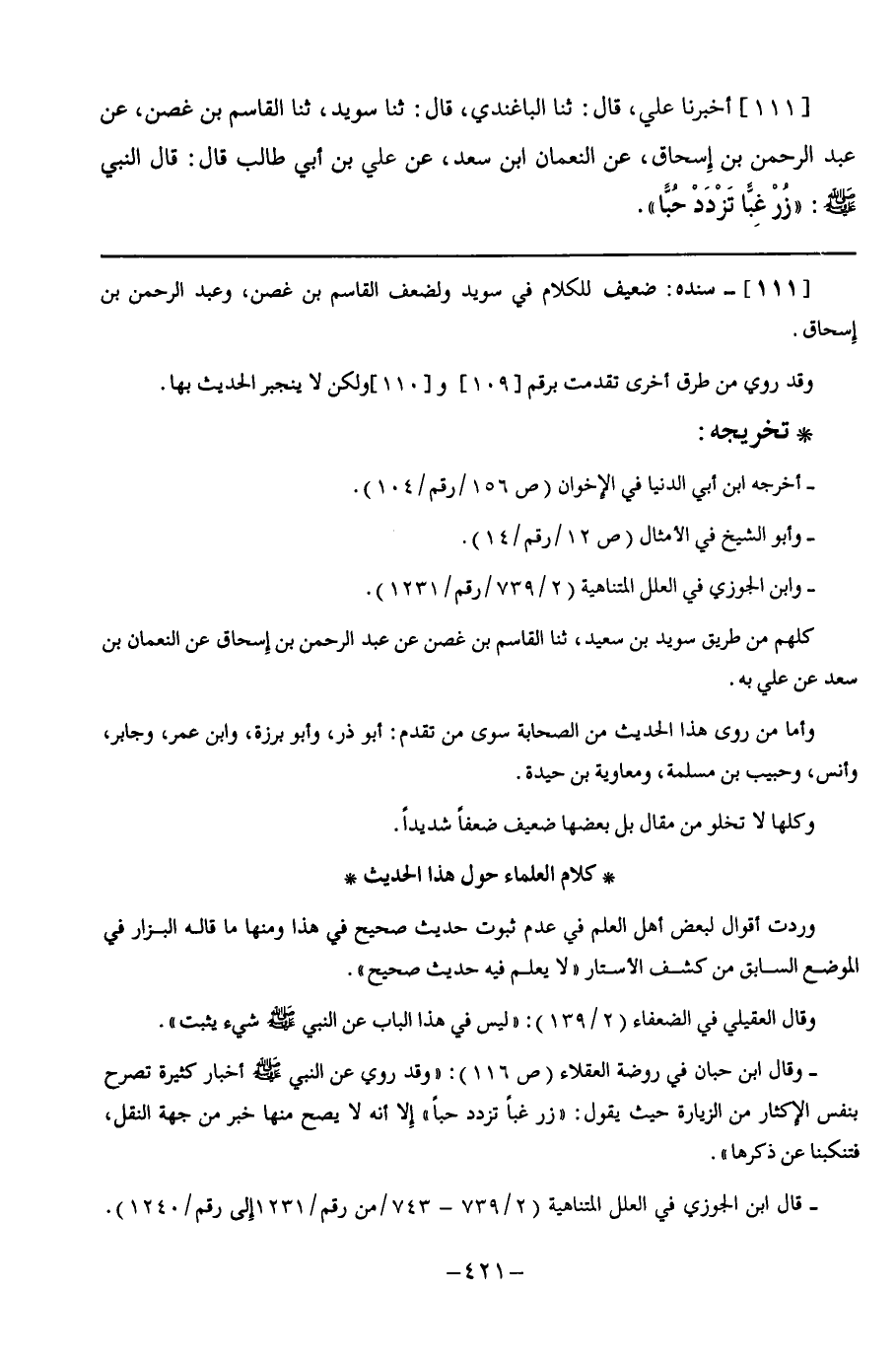 111 - أَخْبَرَنَا عَلِيٌّ قَالَ: ثنا الْبَاغَنْدِيُّ, قَالَ: ثنا سُوَيْدٌ, ثنا الْقَاسِمُ بْنُ غُصْنٍ, عَنْ عَبْدِ الرَّحْمَنِ بْنِ إِسْحَاقَ, عَنِ النُّعْمَانِ بْنِ أَسَعْدٍ, عَنْ عَلِيِّ بْنِ أَبِي طَالِبٍ, قَالَ: قَالَ النَّبِيُّ صَلَّى اللهُ عَلَيْهِ وَسَلَّمَ: §" زُرْ غِبًّا تَزْدَدْ حُبًّا "