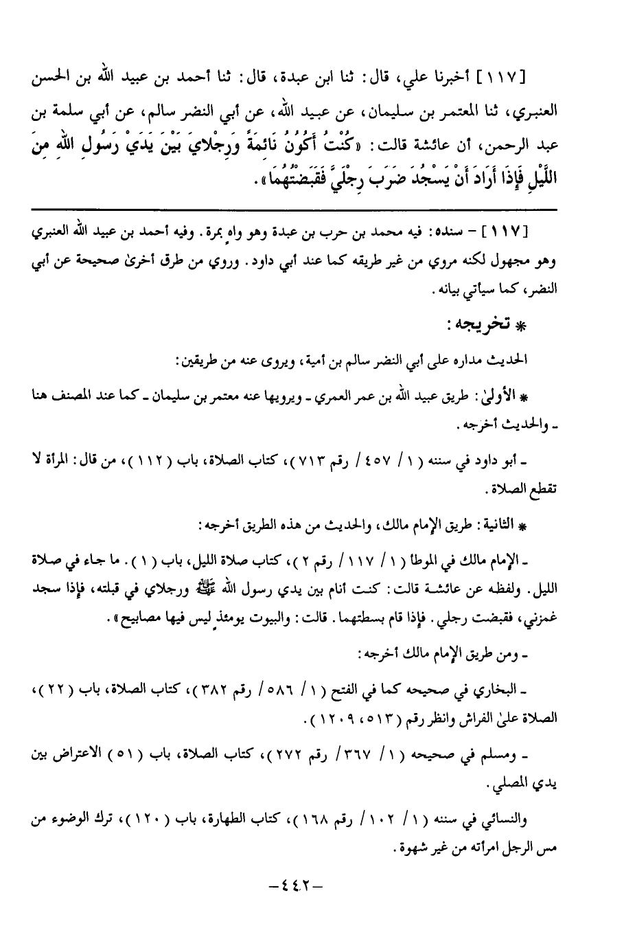 117 - أَخْبَرَنَا عَلِيٌّ قَالَ: ثنا ابْنُ عَبْدَةَ, قَالَ: ثنا أَحْمَدُ بْنُ عُبَيْدِ اللَّهِ بْنِ الْحَسَنِ الْعَنْبَرِيُّ, ثنا الْمُعْتَمِرُ بْنُ سُلَيْمَانَ, عَنْ عُبَيْدِ اللَّهِ, عَنْ أَبِي النَّضْرِ سَالِمٍ, عَنْ أَبِي سَلَمَةَ بْنِ عَبْدِ الرَّحْمَنِ, أَنَّ عَائِشَةَ قَالَتْ: " كُنْتُ أَكُونُ نَائِمَةً وَرِجْلَايَ بَيْنَ يَدَيْ رَسُولِ اللَّهِ مِنَ اللَّيْلِ فَإِذَا أَرَادَ أَنْ يَسْجُدَ §ضَرَبَ رِجْلَيَّ فَقَبَضْتُهُمَا