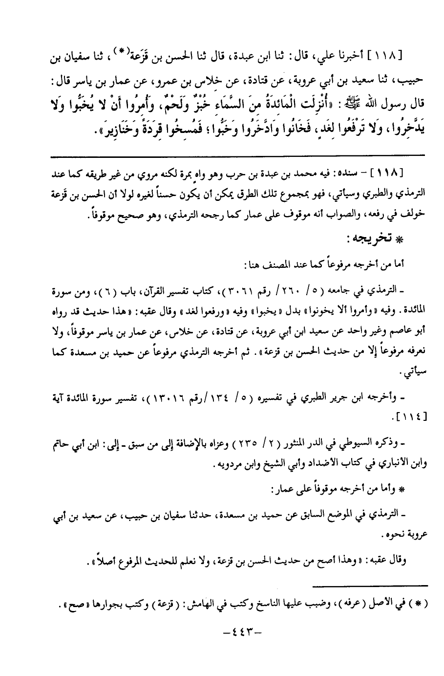 118 - أَخْبَرَنَا عَلِيٌّ قَالَ: ثنا ابْنُ عَبْدَةَ, قَالَ: ثنا الْحَسَنُ بْنُ قَزَعَةَ, ثنا سُفْيَانُ بْنُ حَبِيبٍ, ثنا سَعِيدُ بْنُ أَبِي عَرُوبَةَ, عَنْ قَتَادَةَ, عَنْ خِلَاسِ بْنِ عَمْرٍو, عَنْ عَمَّارِ بْنِ يَاسِرٍ, قَالَ: قَالَ رَسُولُ اللَّهِ صَلَّى اللهُ عَلَيْهِ وَسَلَّمَ: §" أُنْزِلَتِ الْمَائِدَةُ مِنَ السَّمَاءِ خُبْزٌ وَلَحْمٌ, وَأُمِرُوا أَنْ لَا يَخُبُّوا وَلَا يَدَّخِرُوا, وَلَا تَرْفَعُوا لِغَدٍ, فَخَانُوا وَادَّخَرُوا وَخَبُّوا؛ فَمُسِخُوا قِرَدَةً وَخَنَازِيرَ "