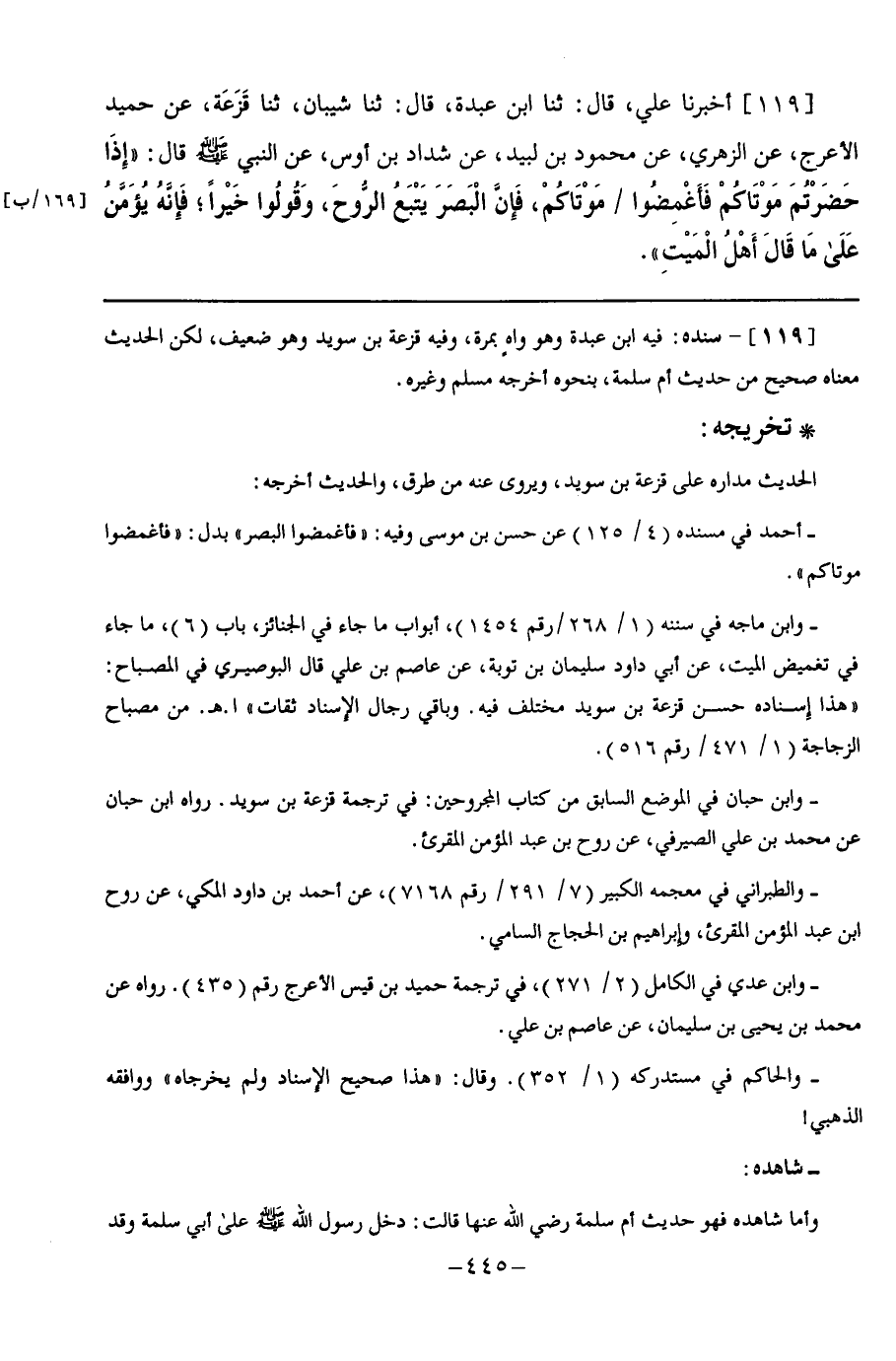 119 - أَخْبَرَنَا عَلِيٌّ قَالَ: ثنا ابْنُ عَبْدَةَ, قَالَ: ثنا شَيْبَانُ, ثنا قَزَعَةُ, عَنْ حُمَيْدٍ الْأَعْرَجِ, عَنِ الزُّهْرِيِّ, عَنْ مَحْمُودِ بْنِ لَبِيدٍ, عَنْ شَدَّادِ بْنِ أَوْسٍ, عَنِ النَّبِيِّ صَلَّى اللهُ عَلَيْهِ وَسَلَّمَ قَالَ: §" إِذَا حَضَرْتُمْ مَوْتَاكُمْ فَأَغْمِضُوا مَوْتَاكُمْ, فَإِنَّ الْبَصَرَ يَتْبَعُ الرُّوحَ, وَقُولُوا خَيْرًا؛ فَإِنَّهُ يُؤَمَّنُ عَلَى مَا قَالَ أَهْلُ الْمَيِّتِ "