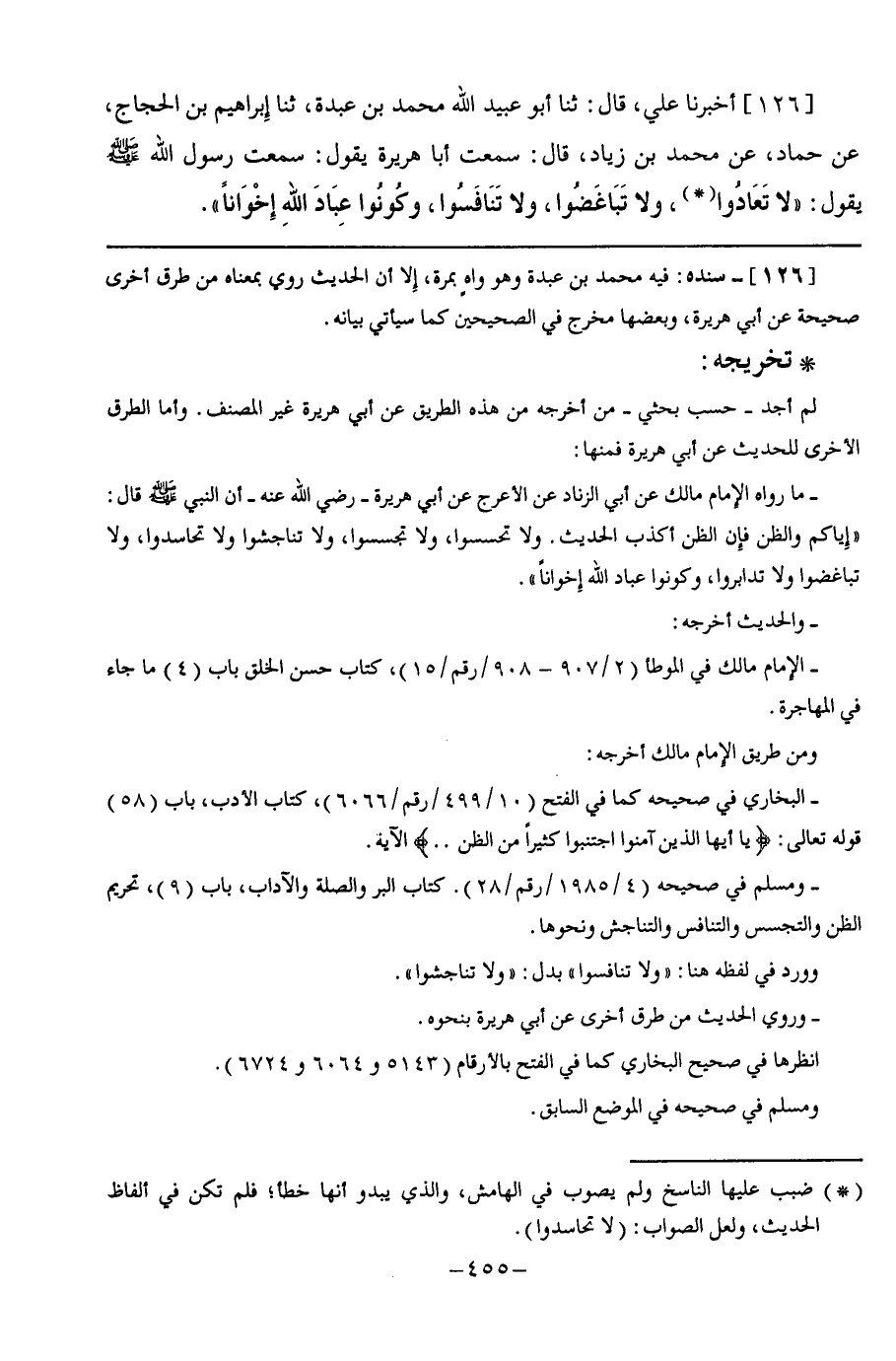 126 - أَخْبَرَنَا عَلِيٌّ قَالَ: ثنا أَبُو عُبَيْدِ اللَّهِ مُحَمَّدُ بْنُ عَبْدَةَ, ثنا إِبْرَاهِيمُ بْنُ الْحَجَّاجِ, عَنْ حَمَّادٍ, عَنْ مُحَمَّدِ بْنِ زِيَادٍ, قَالَ: سَمِعْتُ أَبَا هُرَيْرَةَ يَقُولُ: سَمِعْتُ رَسُولَ اللَّهِ صَلَّى اللهُ عَلَيْهِ وَسَلَّمَ يَقُولُ: §" لَا تَعَادُوا, لَا تَبَاغَضُوا, وَلَا تَنَافَسُوا, وَكُونُوا عِبَادَ اللَّهِ إِخْوَانًا "