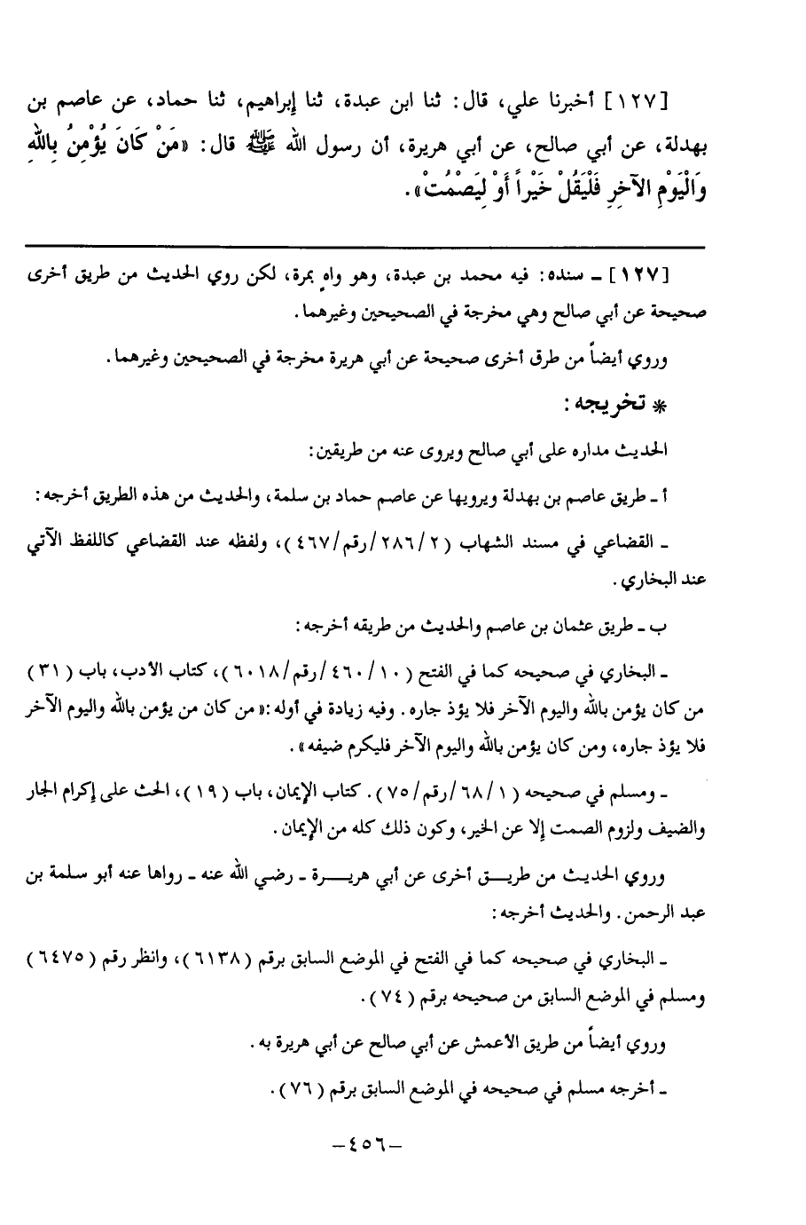 127 - أَخْبَرَنَا عَلِيٌّ قَالَ: ثنا ابْنُ عَبْدَةَ, ثنا إِبْرَاهِيمُ, ثنا حَمَّادٌ, عَنْ عَاصِمِ ابْنِ بَهْدَلَةَ, عَنْ أَبِي صَالِحٍ, عَنْ أَبِي هُرَيْرَةَ, أَنَّ رَسُولَ اللَّهِ صَلَّى اللهُ عَلَيْهِ وَسَلَّمَ قَالَ: §" مَنْ كَانَ يُؤْمِنُ بِاللَّهِ وَالْيَوْمِ الْآخِرِ فَلْيَقُلْ خَيْرًا أَوْ لِيَصْمُتْ "