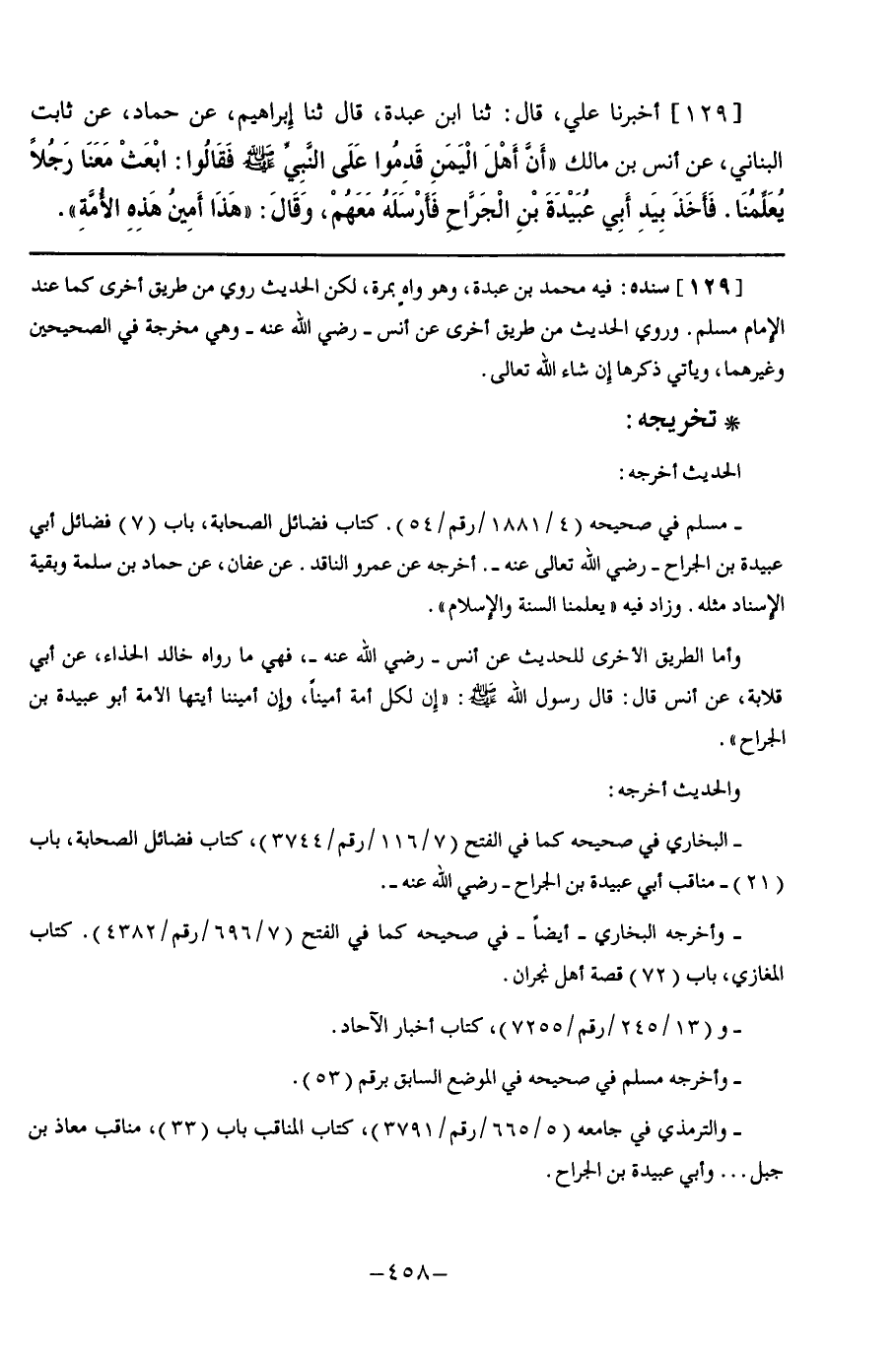 129 - أَخْبَرَنَا عَلِيٌّ قَالَ: ثنا ابْنُ عَبْدَةَ, قَالَ: ثنا إِبْرَاهِيمُ, عَنْ حَمَّادٍ, عَنْ ثَابِتٍ الْبُنَانِيِّ, عَنْ أَنَسِ بْنِ مَالِكٍ, أَنَّ أَهْلَ الْيَمَنِ, قَدِمُوا عَلَى النَّبِيِّ صَلَّى اللهُ عَلَيْهِ وَسَلَّمَ فَقَالُوا: ابْعَثْ مَعَنَا رَجُلًا يُعَلِّمُنَا, فَأَخَذَ بِيَدِ أَبِي عُبَيْدَةَ بْنِ الْجَرَّاحِ فَأَرْسَلَهُ مَعَهُمْ وَقَالَ: §" هَذَا أَمِينُ هَذِهِ الْأُمَّةِ "